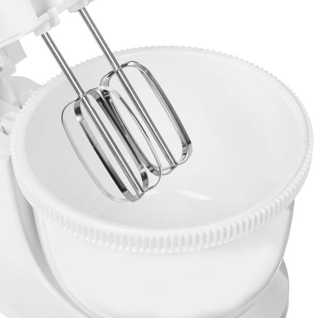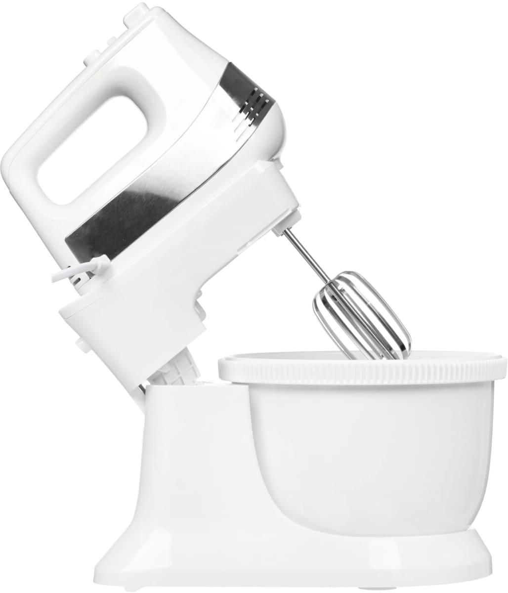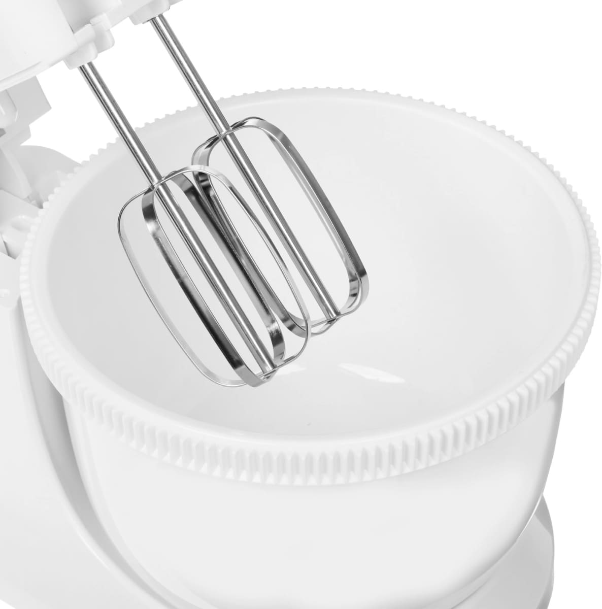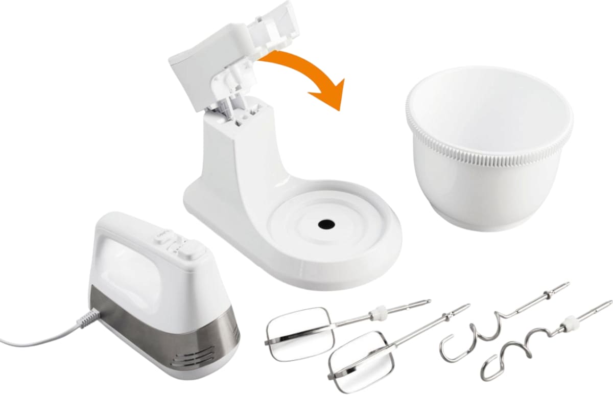 Обратите внимание на цвет миксера Горение — белый — он может стать как гармоничным дополнением кухонной обстановки, так и ярким акцентом. В комплекте с самим прибором идут дополнительные элементы: венчик для взбивания, крюки для теста.
