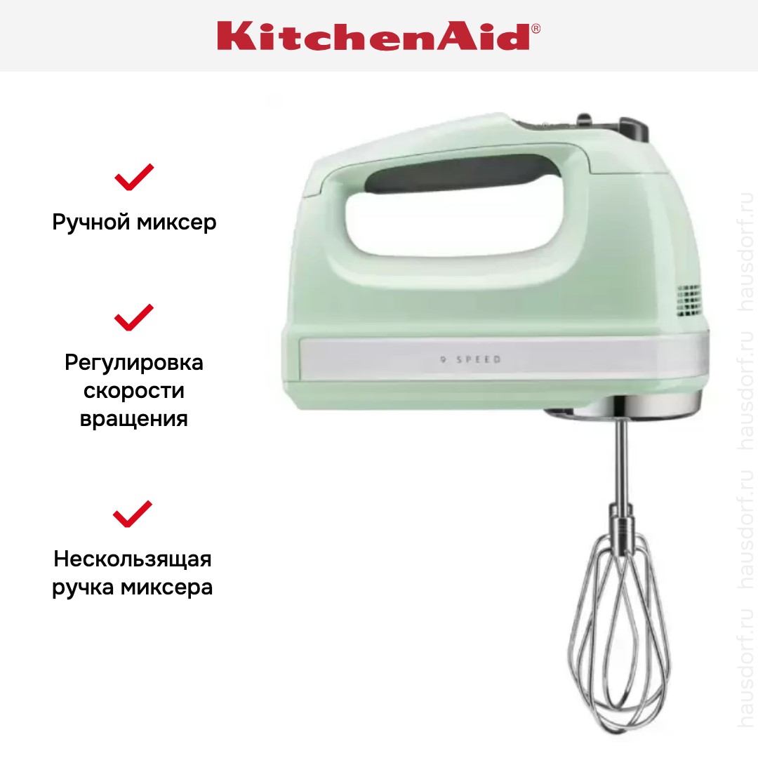 Ручной миксер KitchenAid обладает стандартной мощностью, требует вашего участия в работе — необходимо направлять насадку для грамотного взбивания и смешивания. Доступное количество скоростей — 9 шт.