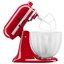 Обратите внимание на цвет миксера Китчен Эйд — красный — он может стать как гармоничным дополнением кухонной обстановки, так и ярким акцентом. В комплекте с самим прибором идут дополнительные элементы: венчик для взбивания, крюки для теста, насадка-лопатка для перемешивания, защитный обод, стальная чаша объемом 3 л, лопатка с гибким ребром.