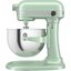 Обратите внимание на цвет миксера Китчен Эйд — фисташковый — он может стать как гармоничным дополнением кухонной обстановки, так и ярким акцентом. В комплекте с самим прибором идут дополнительные элементы: венчик для взбивания, крюки для теста, насадка-лопатка для перемешивания, защитный обод. Также производитель предусмотрел вариант расширения функционала до кухонного комбайна.