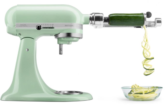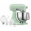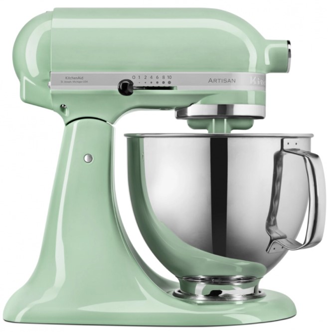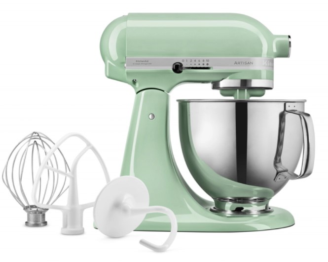 Обратите внимание на цвет миксера Китчен Эйд — фисташковый — он может стать как гармоничным дополнением кухонной обстановки, так и ярким акцентом. В комплекте с самим прибором идут дополнительные элементы: венчик для взбивания, крюки для теста, лопатка с гибким ребром.