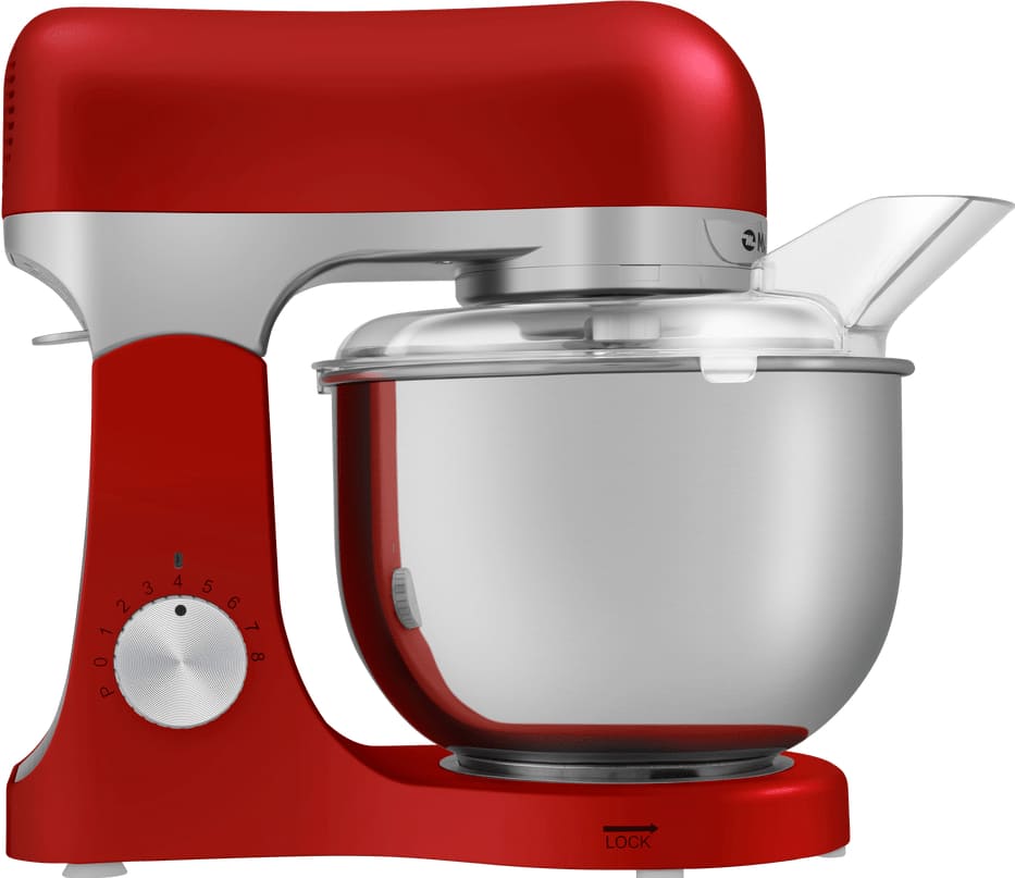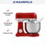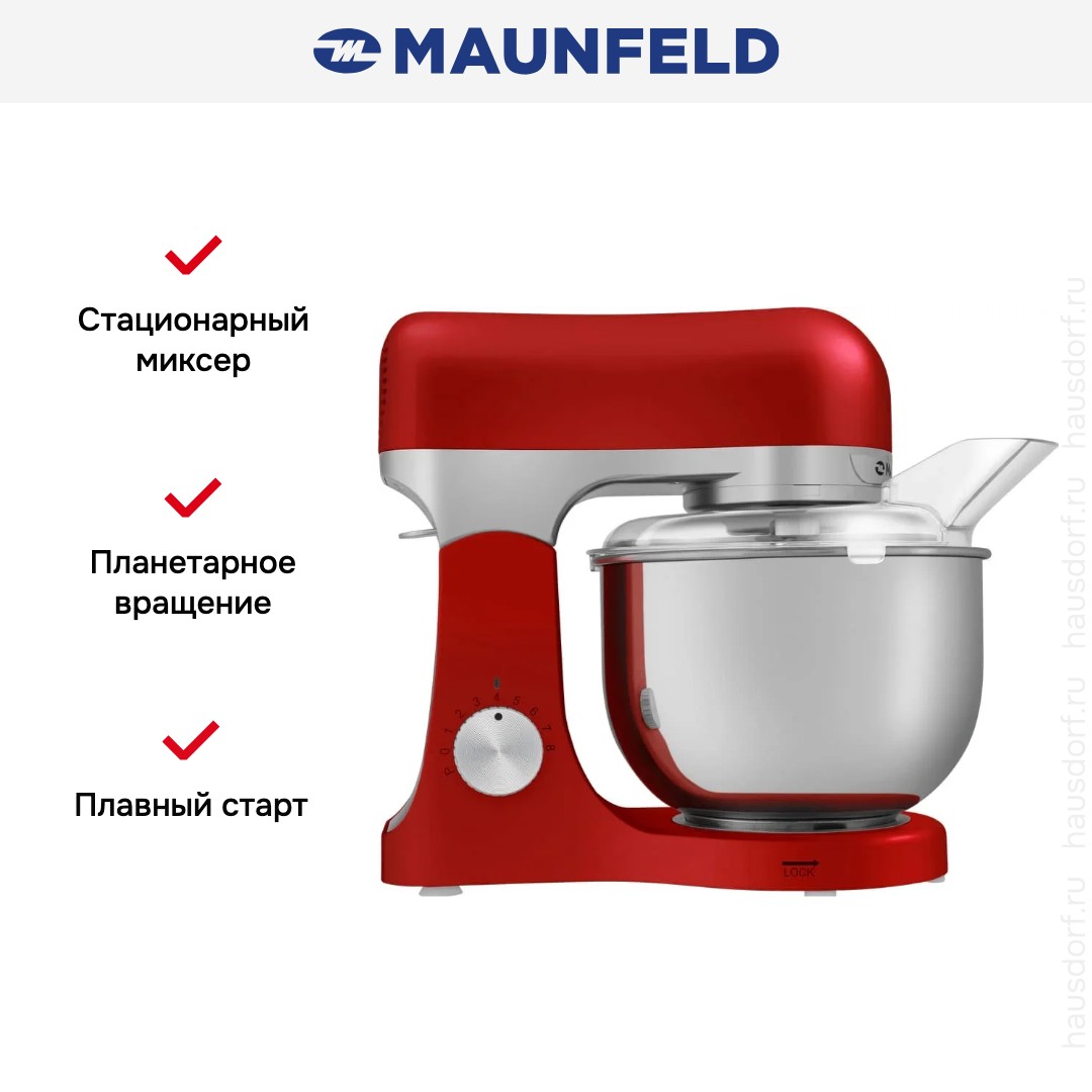 Обратите внимание на цвет миксера Маунфилд — вишня — он может стать как гармоничным дополнением кухонной обстановки, так и ярким акцентом. В комплекте с самим прибором идут дополнительные элементы: венчик для взбивания, защитный обод с воронкой для засыпания продуктов, крюки для теста, насадка-лопатка для перемешивания.