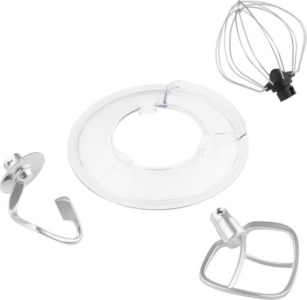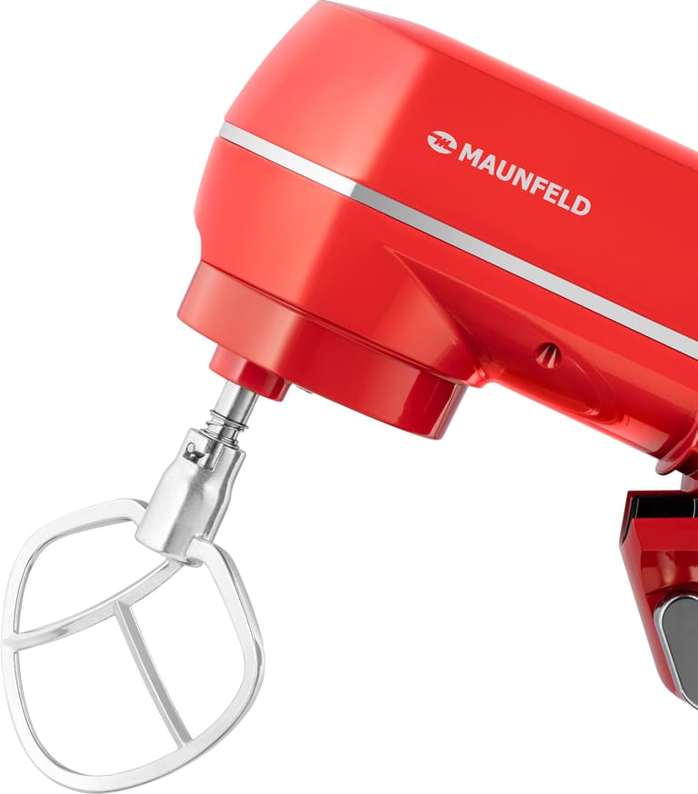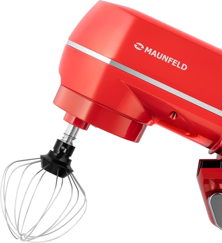 Обратите внимание на цвет миксера Маунфилд — красный — он может стать как гармоничным дополнением кухонной обстановки, так и ярким акцентом. В комплекте с самим прибором идут дополнительные элементы: венчик для взбивания, защитный обод с воронкой для засыпания продуктов, крюки для теста, насадка-лопатка для перемешивания.