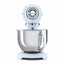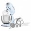 Обратите внимание на цвет миксера Смег — пастельно-голубой — он может стать как гармоничным дополнением кухонной обстановки, так и ярким акцентом. В комплекте с самим прибором идут дополнительные элементы: венчик для взбивания, защитная крышка на чашу, крюки для теста, лопатка с гибким ребром. Вы можете приобрести и установить другие насадки, для них создано специальное гнездо.