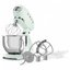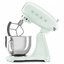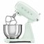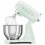 Обратите внимание на цвет миксера Смег — пастельно-зеленый — он может стать как гармоничным дополнением кухонной обстановки, так и ярким акцентом. В комплекте с самим прибором идут дополнительные элементы: венчик для взбивания, защитная крышка на чашу, крюки для теста, лопатка с гибким ребром. Вы можете приобрести и установить другие насадки, для них создано специальное гнездо.