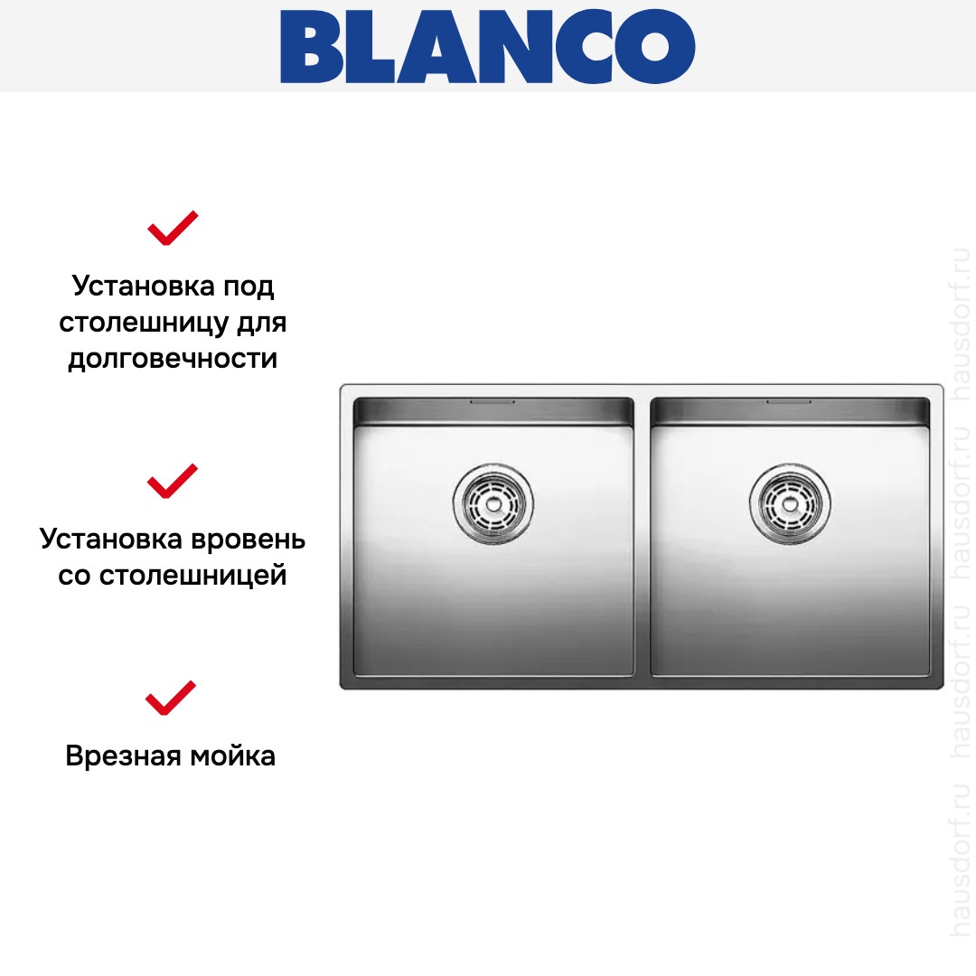 Врезная мойка Blanco — отличный выбор для тех, кто хочет создать гармоничное кухонное пространство с полностью вписывающейся в него сантехникой. Преимущество такой конструкции — плотное прилегание к столешнице, так как вырез подбирается индивидуально под габариты модели. Под стыки не попадает вода, поэтому срок службы значительно увеличивается, пользоваться ей удобно и приятно. Устанавливается вровень со столешницей, благодаря чему не остается стыков, в которых копились бы загрязнения.
