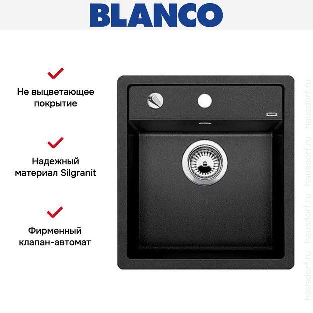 Компактный размер в сочетании с вместительной чашей — отличительная особенность модели. Просторная площадка под смеситель позволяет расположить дополнительные аксессуары или кухонные принадлежности. Поверхность устойчива к пищевым красителям и бытовой химии. Материал Silgranit характеризует высокий уровень гигиены — в структуре композита нет органических соединений. Silgranit не впитывает воду, не меняет цвета под воздействием красящих веществ и обладает доказанными антибактериальными свойствами. Чаша прямоугольной формы глубиной 19 см обеспечивает максимальное удобство при мытье объемной посуды и продуктов. Благодаря скругленным углам ухаживать за ней очень просто. Клапан-автомат с отводной арматурой позволяет начать слив нажатием кнопки на бортике, не опуская руки в воду. Дополнительно можно приобрести разделочную доску из натурального бука. Модель изготавливается на предприятии Blanco в Германии и имеет официальную гарантию производителя сроком на 60 месяцев.