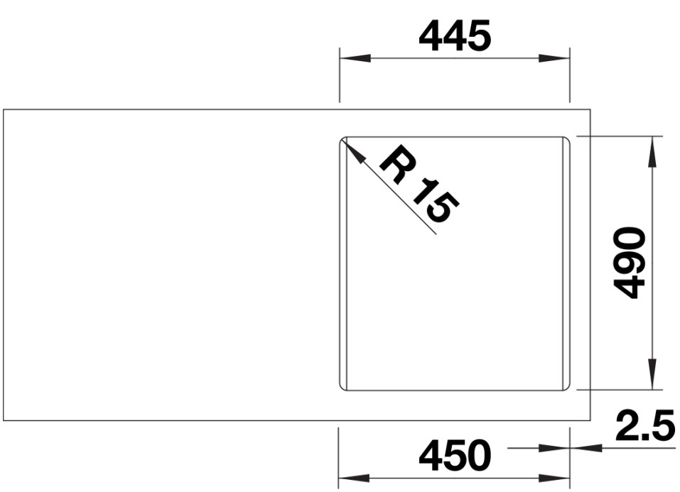 Габариты 46.5×51 см и один просторный бок размером 39.5×40 см обеспечивают комфорт при мытье посуды несмотря на компактность. Глубина чаши 20 см позволяет работать с кастрюлями и сковородами без брызг, но не требует чрезмерного объёма под столешницей. Ширина базы 45 см и размеры монтажного отверстия 44.5×49 см пригодятся при планировании мебели, а радиус скругления шаблона 1.5 см облегчает точную вырезку и придаёт столешнице аккуратный вид.