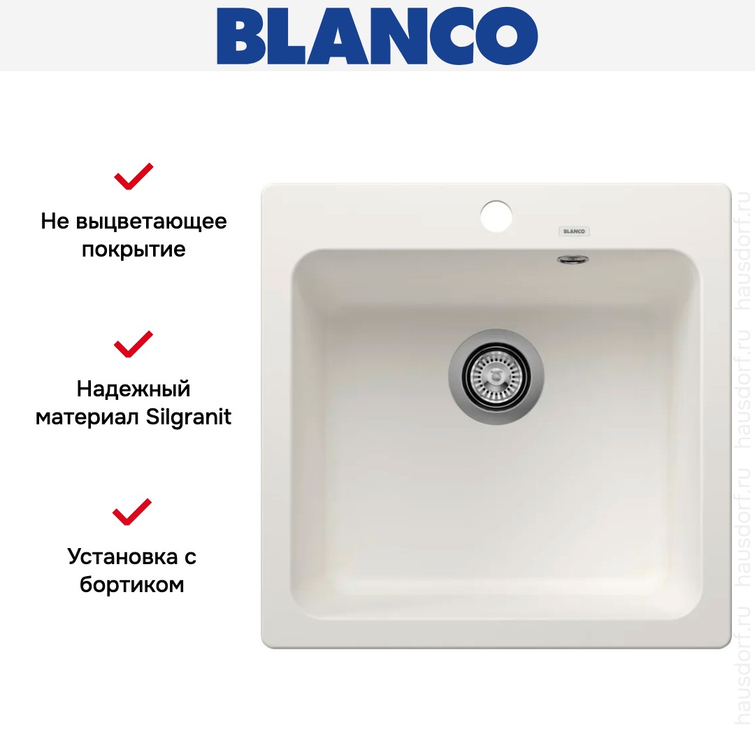 Обратите внимание на дизайнерские отличия мойки Бланко, которые помогут в создании идеальной кухни в вашем доме. Она выполнена в цвете белый. Основной материал — Silgranit, он гарантирует надежность и долгие годы службы без повреждений.