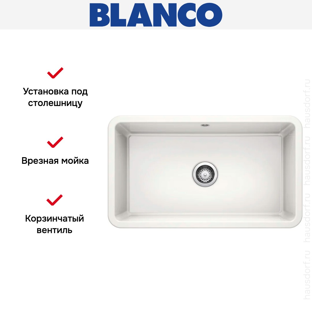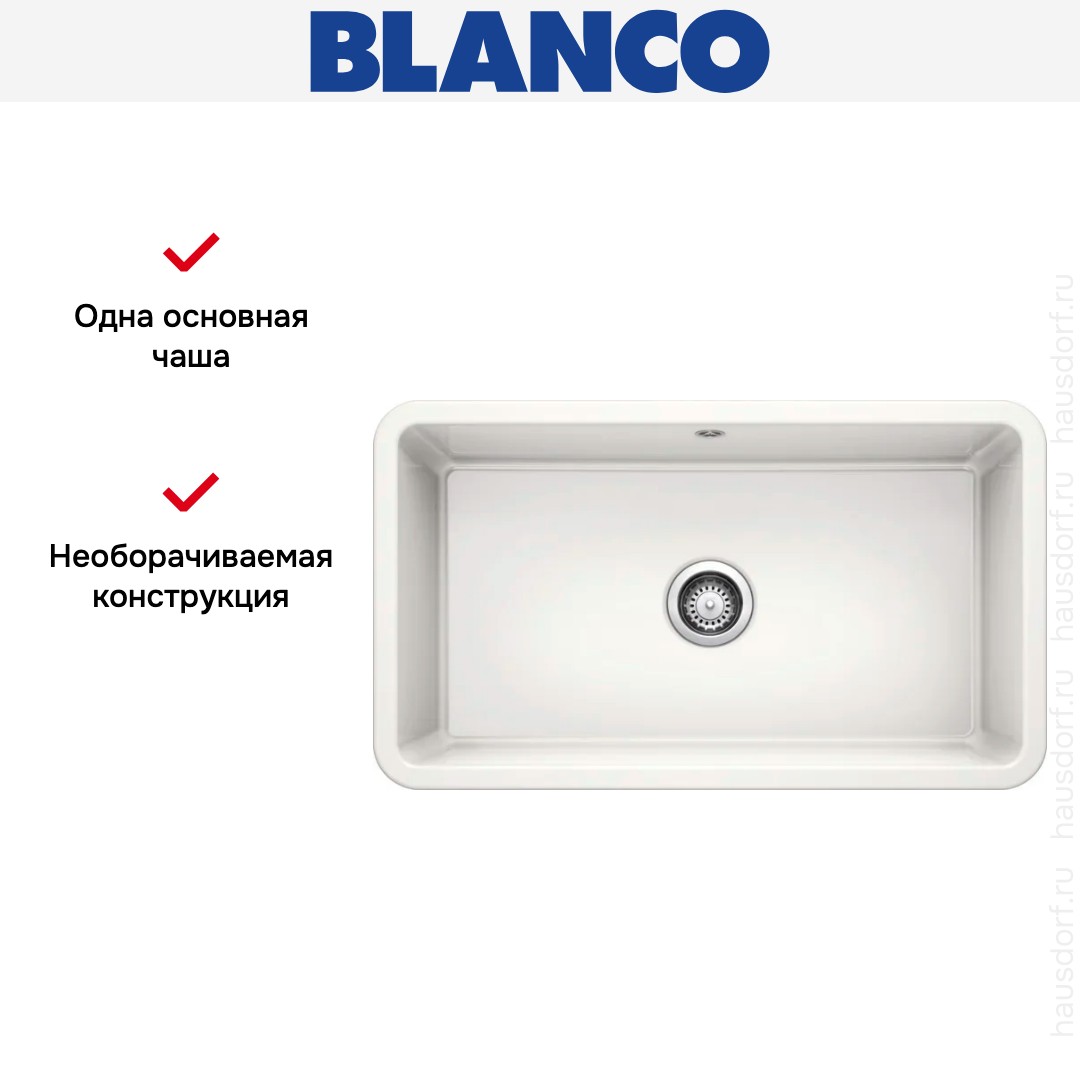 Обратите внимание на дизайнерские отличия мойки Бланко, которые помогут в создании идеальной кухни в вашем доме. Она выполнена в цвете глянцевый белый. Основной материал — керамика, за ней нужно тщательно и бережно ухаживать, зато такое исполнение добавляет интерьеру изящества.