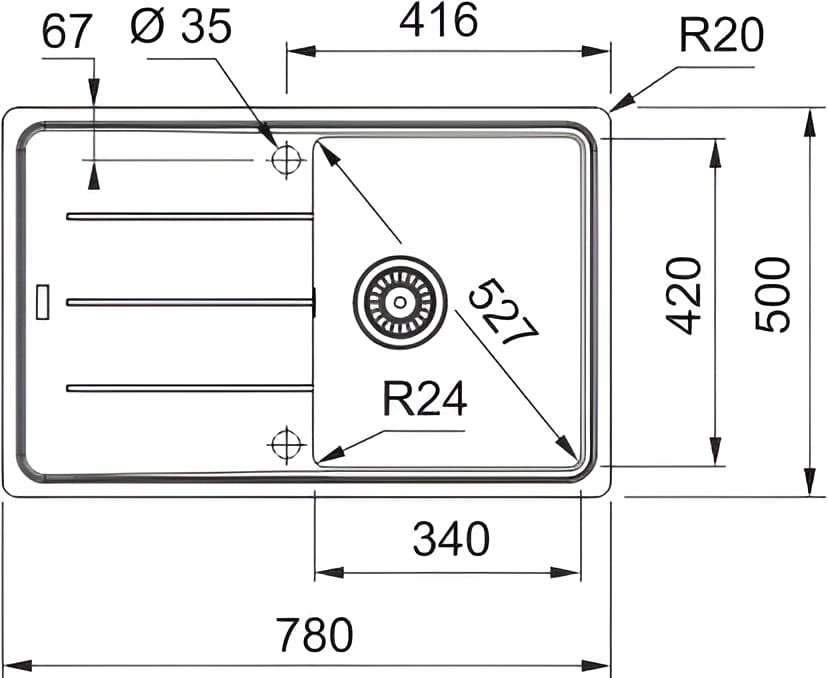 Стандартными считаются модели с одной квадратной или круглой чашей, без крыла. Ширина для квадратных моек при этом составляет 50-60 см, круглые модели имеют диаметр около 50-55 см. Для моделей с одной чашей и крылом ширина может достигать 60-80 см. Изделия с двумя основными чашами имеют ширину до 90 см.