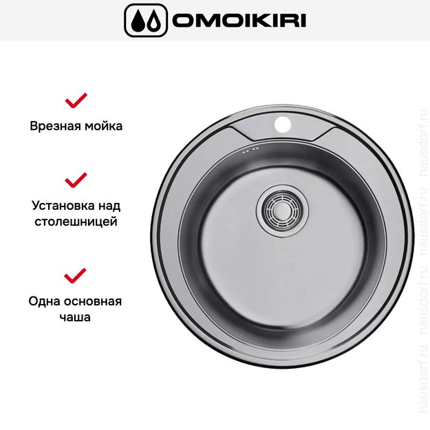 Накладная мойка Omoikiri — отличный выбор для тех, кто хочет создать гармоничное пространство с удобной сантехникой. простой в установке. Преимущество такой конструкции: легко подобрать практически к любой кухне и не придется демонтировать вместе с тумбой при ремонте или перестановке остальной мебели. Данная модель имеет скругленный контур, поэтому выбор тумбочки для нее потребует дополнительного внимания. Устанавливается над столешницей: это самый простой способ монтажа, зачастую с ним можно справиться даже без специалистов, главное — правильно рассчитать размеры ниши.