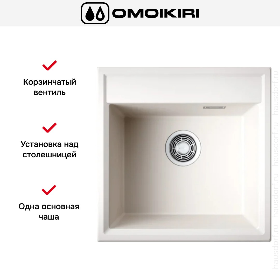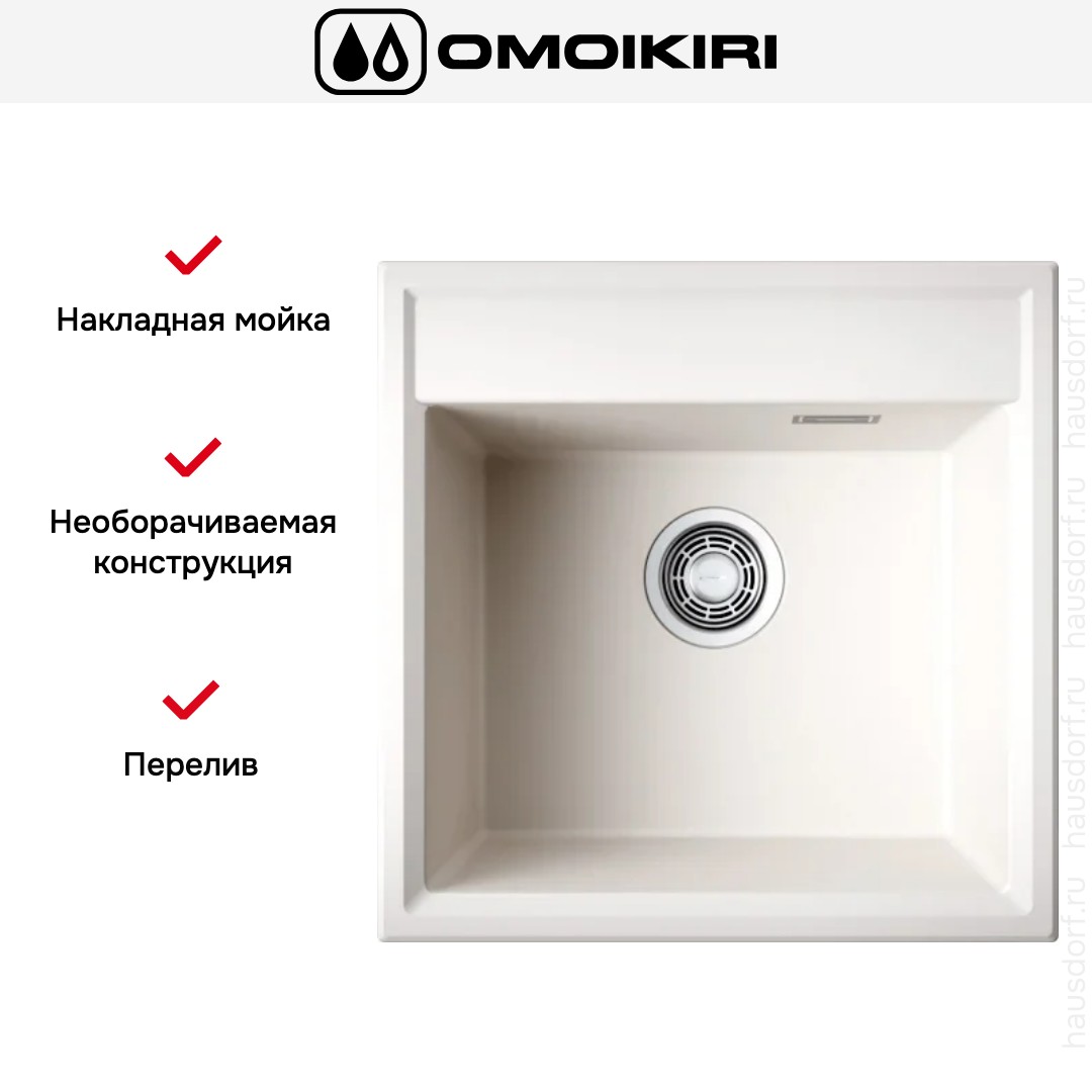 Накладная мойка Omoikiri — отличный выбор для тех, кто хочет создать гармоничное пространство с удобной сантехникой. простой в установке. Преимущество такой конструкции: легко подобрать практически к любой кухне и не придется демонтировать вместе с тумбой при ремонте или перестановке остальной мебели. Данная модель имеет стандартную форму, поэтому подходит большинству пользователей. Устанавливается над столешницей: это самый простой способ монтажа, зачастую с ним можно справиться даже без специалистов, главное — правильно рассчитать размеры ниши.