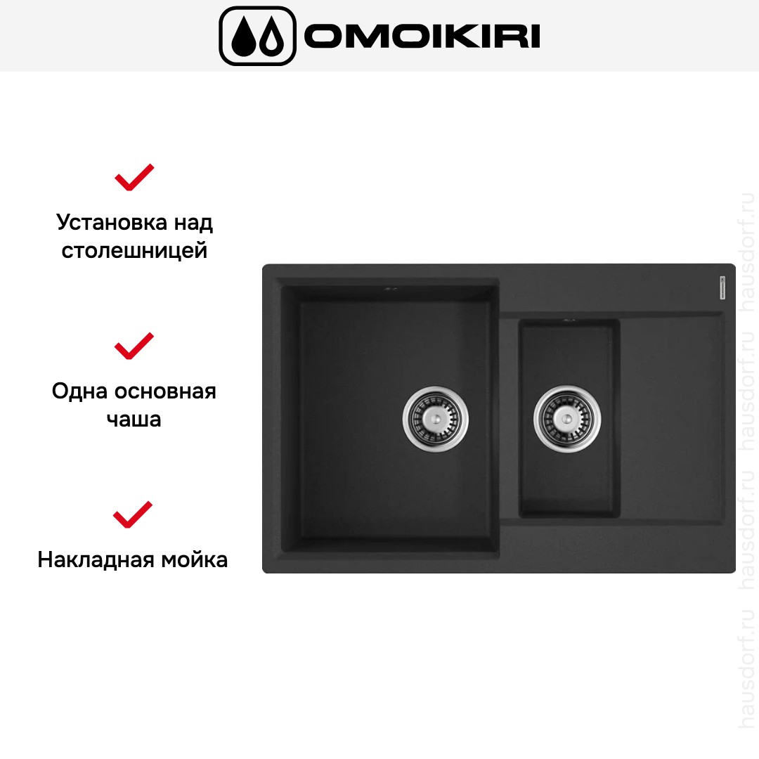 Накладная мойка Omoikiri — отличный выбор для тех, кто хочет создать гармоничное пространство с удобной сантехникой. простой в установке. Преимущество такой конструкции: легко подобрать практически к любой кухне и не придется демонтировать вместе с тумбой при ремонте или перестановке остальной мебели. Данная модель имеет стандартную форму, поэтому подходит большинству пользователей. Устанавливается над столешницей: это самый простой способ монтажа, зачастую с ним можно справиться даже без специалистов, главное — правильно рассчитать размеры ниши.