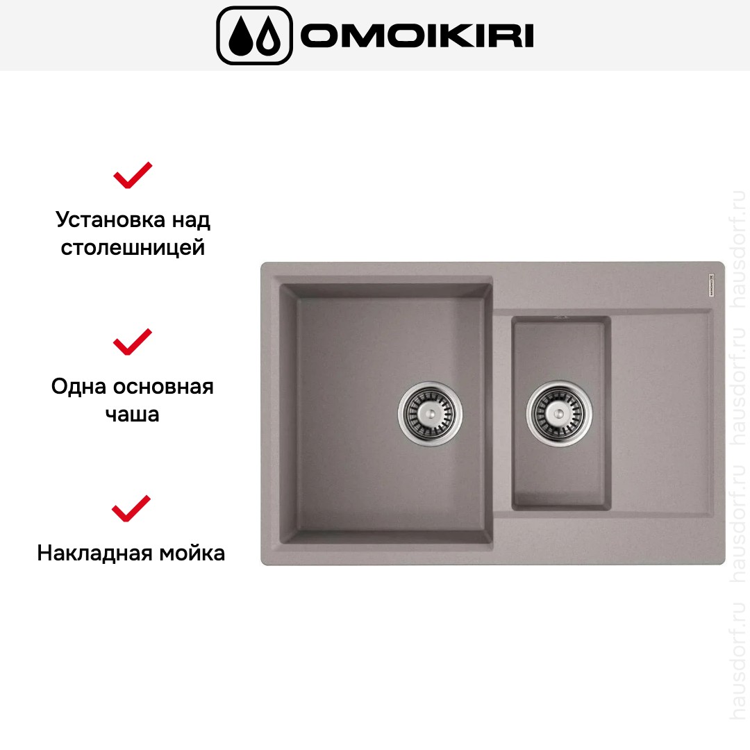 Накладная мойка Omoikiri — отличный выбор для тех, кто хочет создать гармоничное пространство с удобной сантехникой. простой в установке. Преимущество такой конструкции: легко подобрать практически к любой кухне и не придется демонтировать вместе с тумбой при ремонте или перестановке остальной мебели. Данная модель имеет стандартную форму, поэтому подходит большинству пользователей. Устанавливается над столешницей: это самый простой способ монтажа, зачастую с ним можно справиться даже без специалистов, главное — правильно рассчитать размеры ниши.