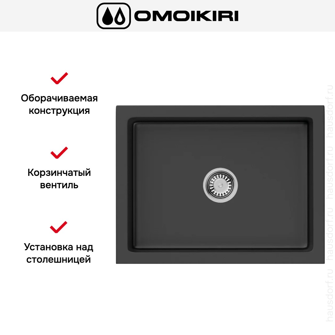 Мойка OMOIKIRI Mikura 61 BL представляет собой модульное прямоугольное решение для кухни с размерами 61×46 см и стильным черным цветом. Она устанавливается над столешницей и изготавливается методом литья из материала NatCeramic, что обеспечивает цельную и прочную конструкцию. Вес изделия составляет 27,3 кг, благодаря чему раковина плотно сидит в вырезе и не шатается при эксплуатации.