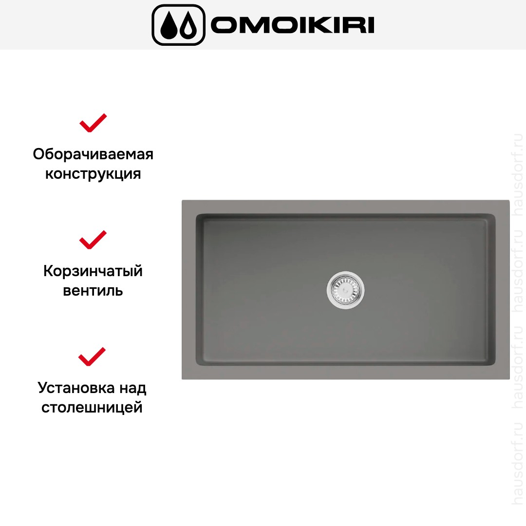 Мойка OMOIKIRI Mikura 76 PE прекрасно сочетает модульную концепцию и прямоугольную форму, предлагая компактные габариты 76×46 см. Эта модель устанавливается над столешницей и рассчитана на базу шириной 80 см, что облегчает подбор мебели. Оборачиваемая конструкция дает свободу ориентировать рабочую зону под планировку кухни. Монтажное отверстие вырезается по образцу изделия, что минимизирует погрешности при установке.