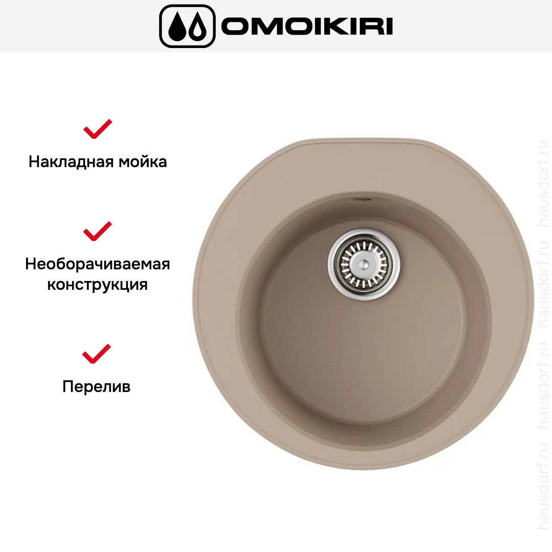 Накладная мойка Omoikiri — отличный выбор для тех, кто хочет создать гармоничное пространство с удобной сантехникой. простой в установке. Преимущество такой конструкции: легко подобрать практически к любой кухне и не придется демонтировать вместе с тумбой при ремонте или перестановке остальной мебели. Данная модель имеет скругленный контур, поэтому выбор тумбочки для нее потребует дополнительного внимания. Устанавливается над столешницей: это самый простой способ монтажа, зачастую с ним можно справиться даже без специалистов, главное — правильно рассчитать размеры ниши.