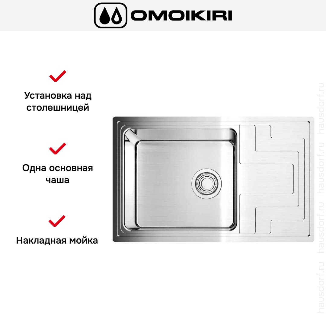Накладная мойка Omoikiri — отличный выбор для тех, кто хочет создать гармоничное пространство с удобной сантехникой. простой в установке. Преимущество такой конструкции: легко подобрать практически к любой кухне и не придется демонтировать вместе с тумбой при ремонте или перестановке остальной мебели. Данная модель имеет стандартную форму, поэтому подходит большинству пользователей. Устанавливается над столешницей: это самый простой способ монтажа, зачастую с ним можно справиться даже без специалистов, главное — правильно рассчитать размеры ниши.