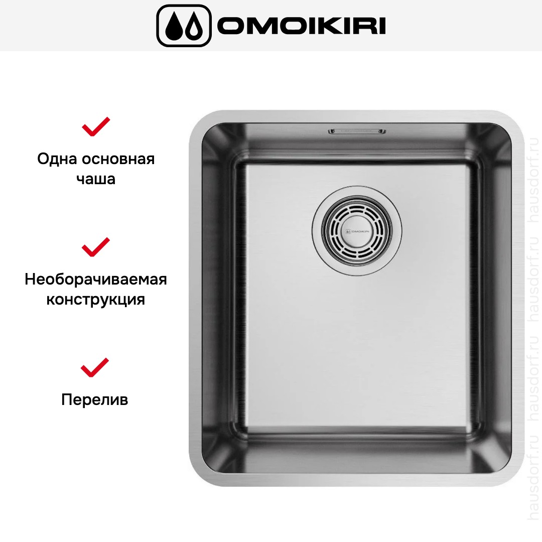 Врезная мойка Omoikiri — отличный выбор для тех, кто хочет создать гармоничное кухонное пространство с полностью вписывающейся в него сантехникой. Преимущество такой конструкции — плотное прилегание к столешнице, так как вырез подбирается индивидуально под габариты модели. Под стыки не попадает вода, поэтому срок службы значительно увеличивается, пользоваться ей удобно и приятно. Данная модель имеет стандартную форму, поэтому подходит большинству пользователей. Устанавливается под столешницу, благодаря чему не остается стыков, в которых копились бы загрязнения, а также увеличивается рабочая глубина.