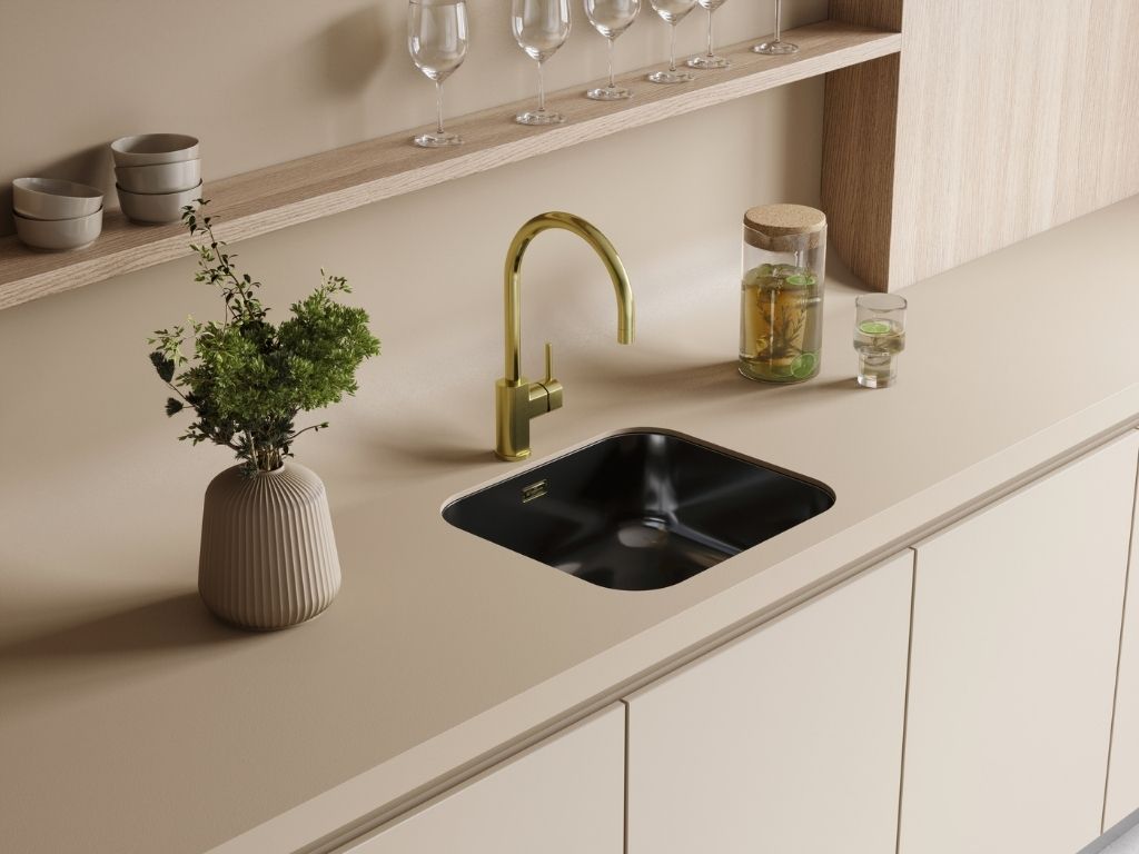 вровень со столешницей — создается ощущение бесшовного пространства, а если мойка сделана из того же материала, то и единого дизайна;