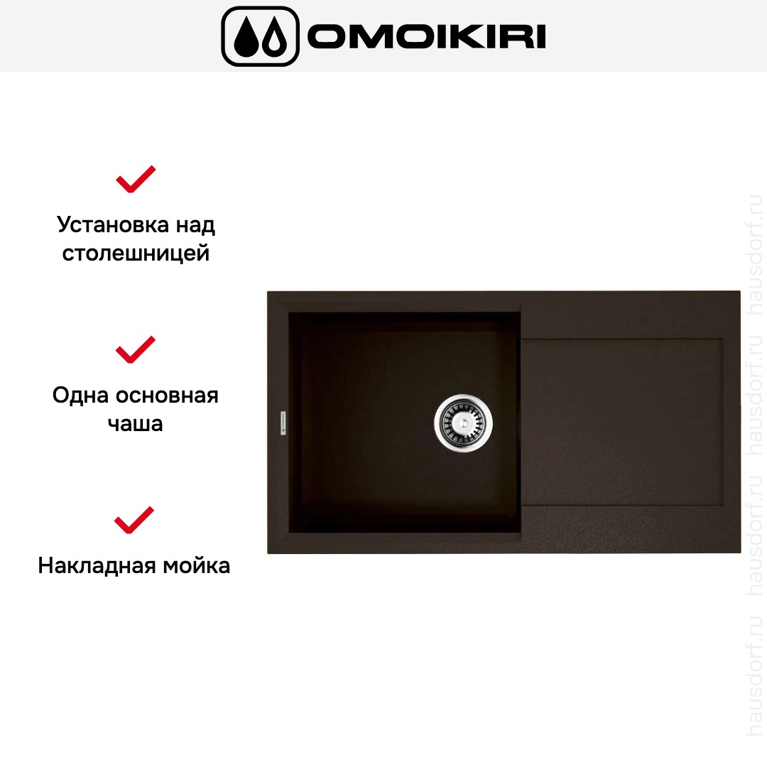 Накладная мойка Omoikiri — отличный выбор для тех, кто хочет создать гармоничное пространство с удобной сантехникой. простой в установке. Преимущество такой конструкции: легко подобрать практически к любой кухне и не придется демонтировать вместе с тумбой при ремонте или перестановке остальной мебели. Данная модель имеет стандартную форму, поэтому подходит большинству пользователей. Устанавливается над столешницей: это самый простой способ монтажа, зачастую с ним можно справиться даже без специалистов, главное — правильно рассчитать размеры ниши.