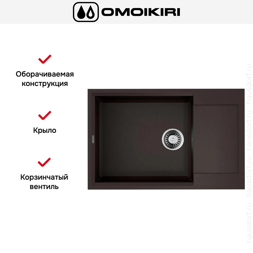 Обратите внимание на дизайнерские отличия мойки Омойкири, которые помогут в создании идеальной кухни в вашем доме. Она выполнена в цвете темный шоколад. Крыло, расположенное слева или справа, является дополнительным рабочим пространством, на котором можно сушить посуду, разделывать мясо и нарезать овощи.