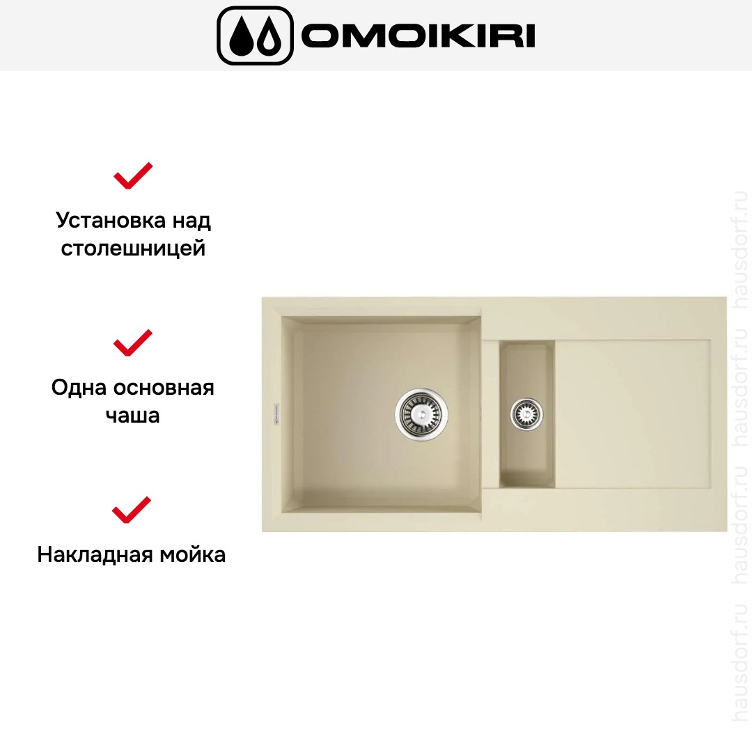 Мойка Omoikiri Sakaime 86-2 BE — стильное и практичное решение для современной кухни. Внешний вид лаконичен: строгая прямоугольная форма и цвет «Ваниль» создают теплую, нейтральную базу. Поверхность выглядит монолитно благодаря материалу TetoGranit. Толщина стенки 10 мм обеспечивает солидный профиль и устойчивость к деформациям под нагрузкой. Благодаря весу изделия конструкция ощущается надежной.