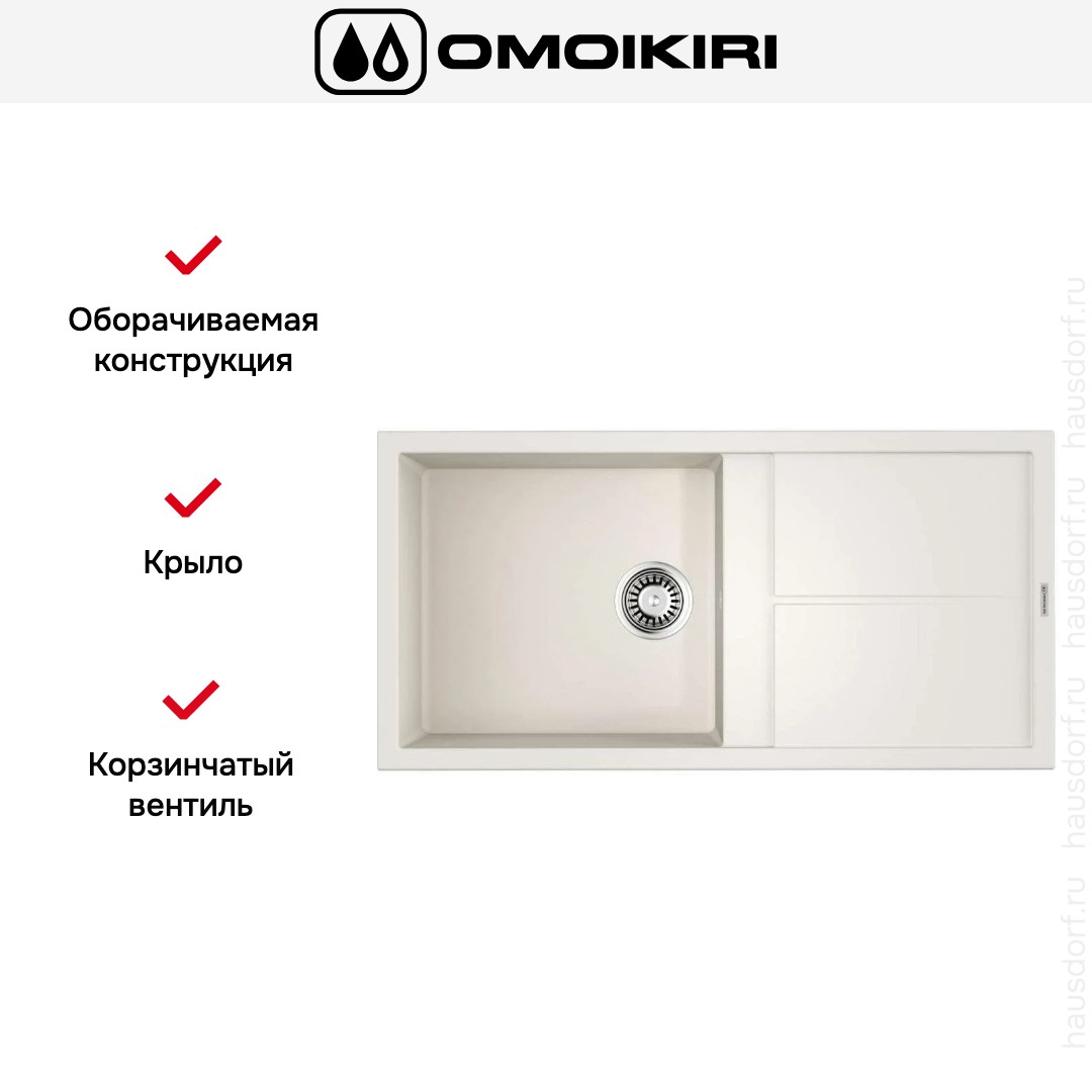 Обратите внимание на дизайнерские отличия мойки Омойкири, которые помогут в создании идеальной кухни в вашем доме. Она выполнена в цвете белый. Крыло, расположенное является дополнительным рабочим пространством, на котором можно сушить посуду, разделывать мясо и нарезать овощи.