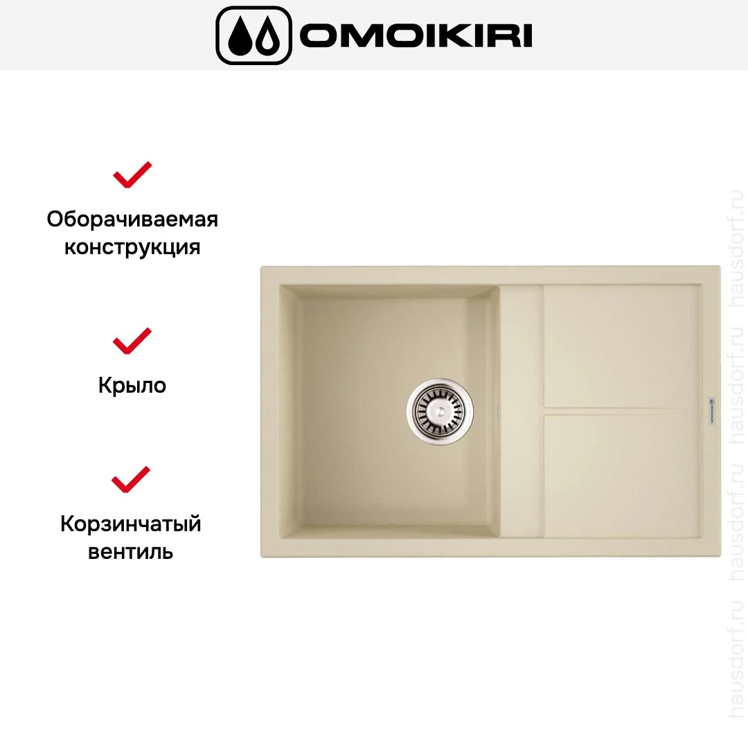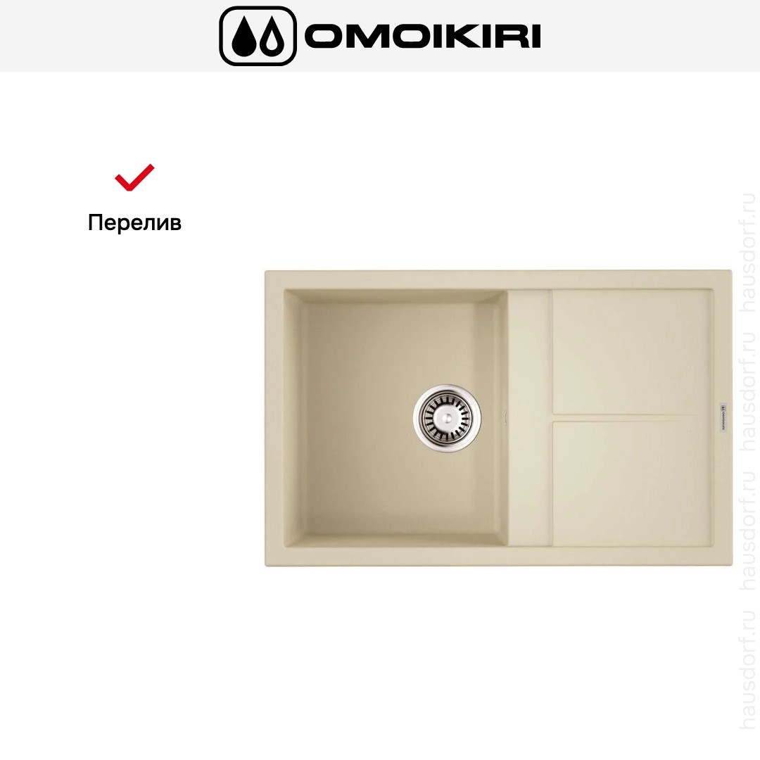 Мойка OMOIKIRI SUMI 79 BE — накладная прямоугольная модель шириной 79 см и глубиной 50 см. Ее компактные габариты 79×50 см подходят для большинства кухонных столешниц и оставляют достаточно места для рабочей зоны.