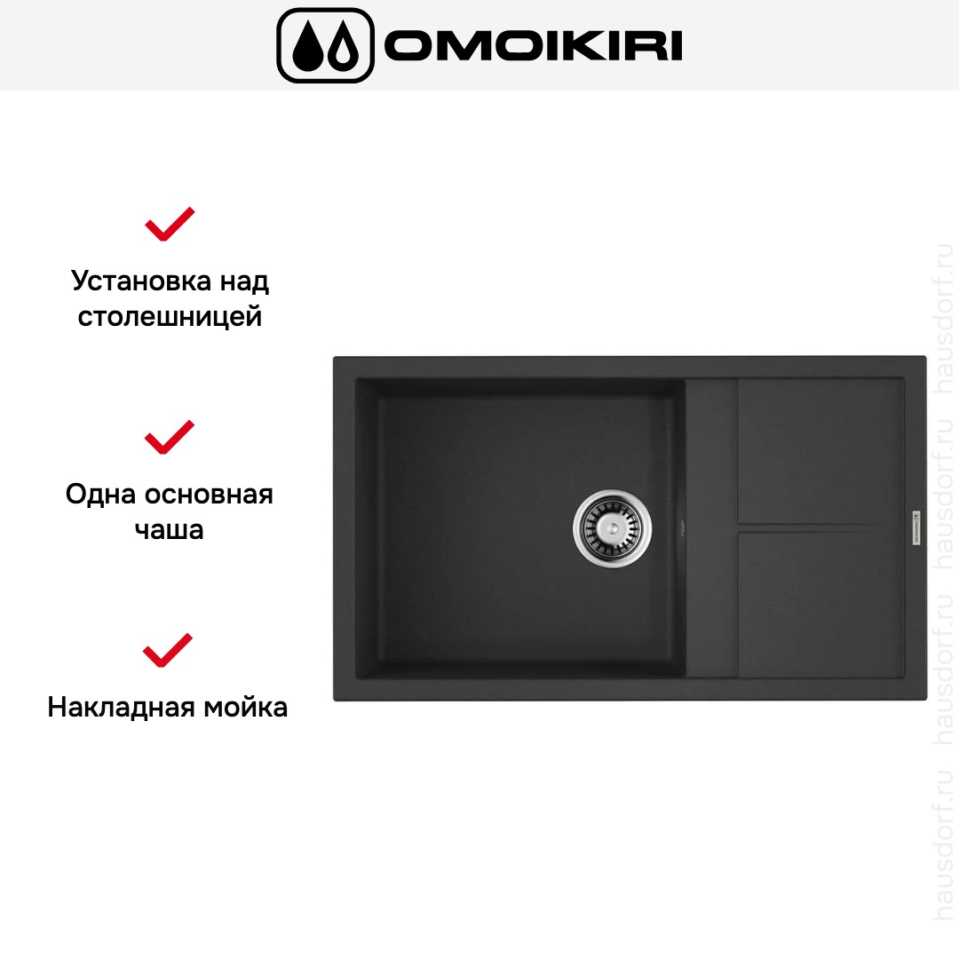Накладная мойка Omoikiri — отличный выбор для тех, кто хочет создать гармоничное пространство с удобной сантехникой. простой в установке. Преимущество такой конструкции: легко подобрать практически к любой кухне и не придется демонтировать вместе с тумбой при ремонте или перестановке остальной мебели. Данная модель имеет стандартную форму, поэтому подходит большинству пользователей. Устанавливается над столешницей: это самый простой способ монтажа, зачастую с ним можно справиться даже без специалистов, главное — правильно рассчитать размеры ниши.