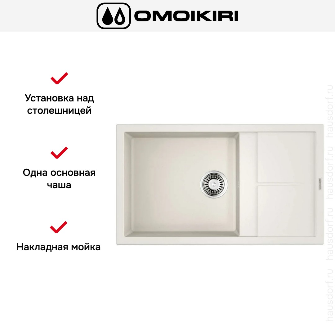 Мойка Omoikiri Sumi 86 WH — накладная прямоугольная модель белого цвета, разработанная для практичных кухонь, где важны простота установки и эргономика. Она имеет общие габариты 86×50 см и тонко вписывается на столешницу благодаря продуманным пропорциям и аккуратной отделке.
