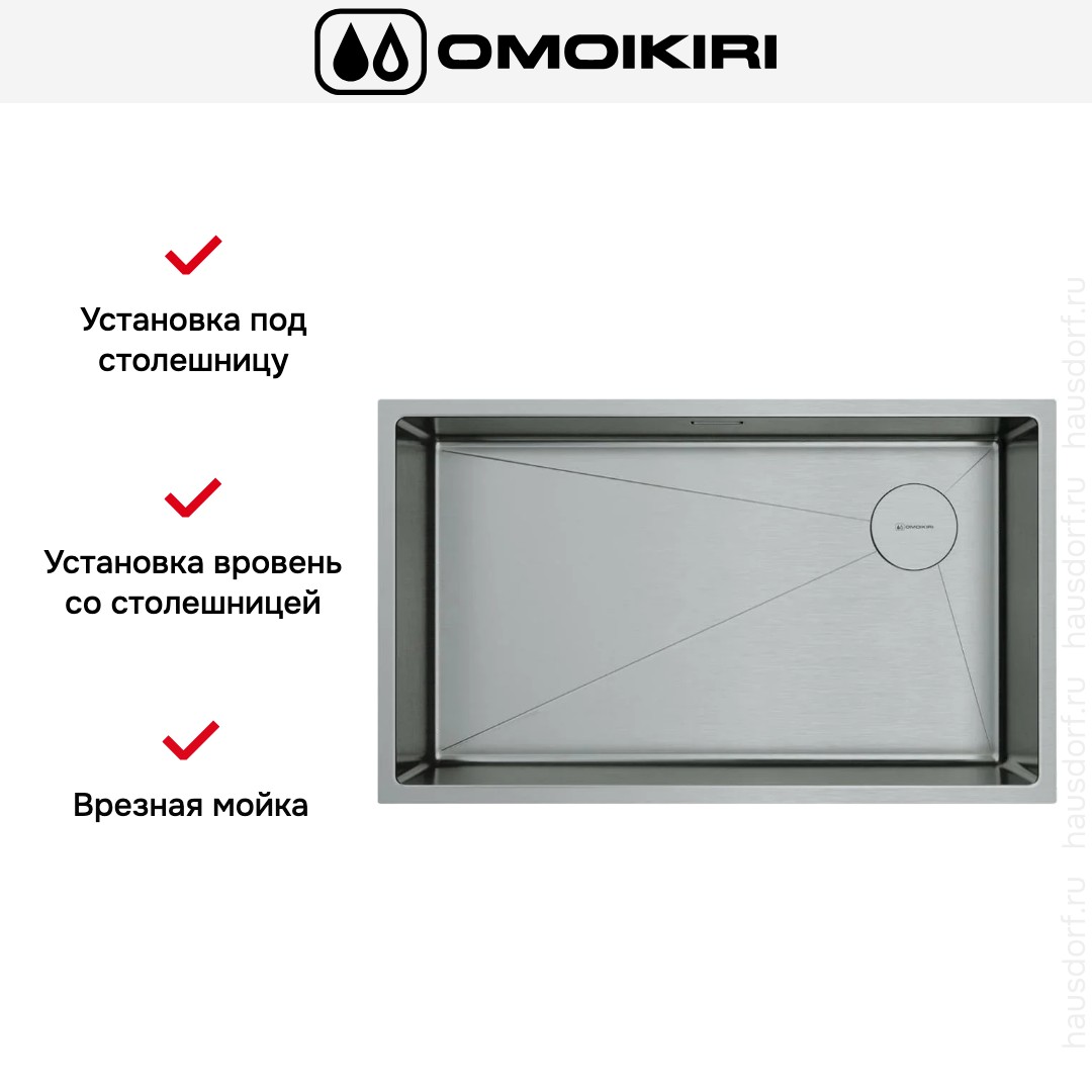 Врезная мойка Omoikiri — отличный выбор для тех, кто хочет создать гармоничное кухонное пространство с полностью вписывающейся в него сантехникой. Преимущество такой конструкции — плотное прилегание к столешнице, так как вырез подбирается индивидуально под габариты модели. Под стыки не попадает вода, поэтому срок службы значительно увеличивается, пользоваться ей удобно и приятно. Данная модель имеет стандартную форму, поэтому подходит большинству пользователей. Устанавливается вровень со столешницей, благодаря чему не остается стыков, в которых копились бы загрязнения. Устанавливается под столешницу, благодаря чему не остается стыков, в которых копились бы загрязнения, а также увеличивается рабочая глубина. Устанавливается над столешницей: это самый простой способ монтажа, зачастую с ним можно справиться даже без специалистов, главное — правильно рассчитать размеры ниши.