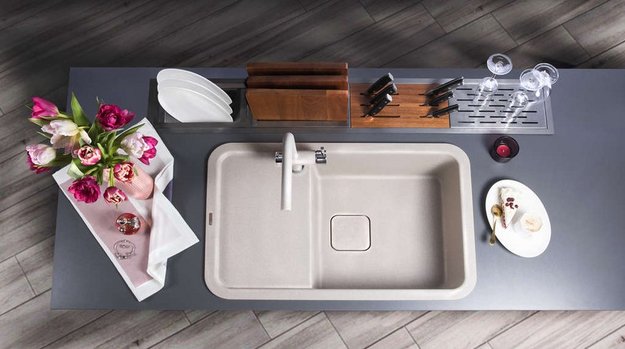 Интегрированная — встраиваемая модель из того же материала, что и столешница. Благодаря этому она выглядит как часть мебели.