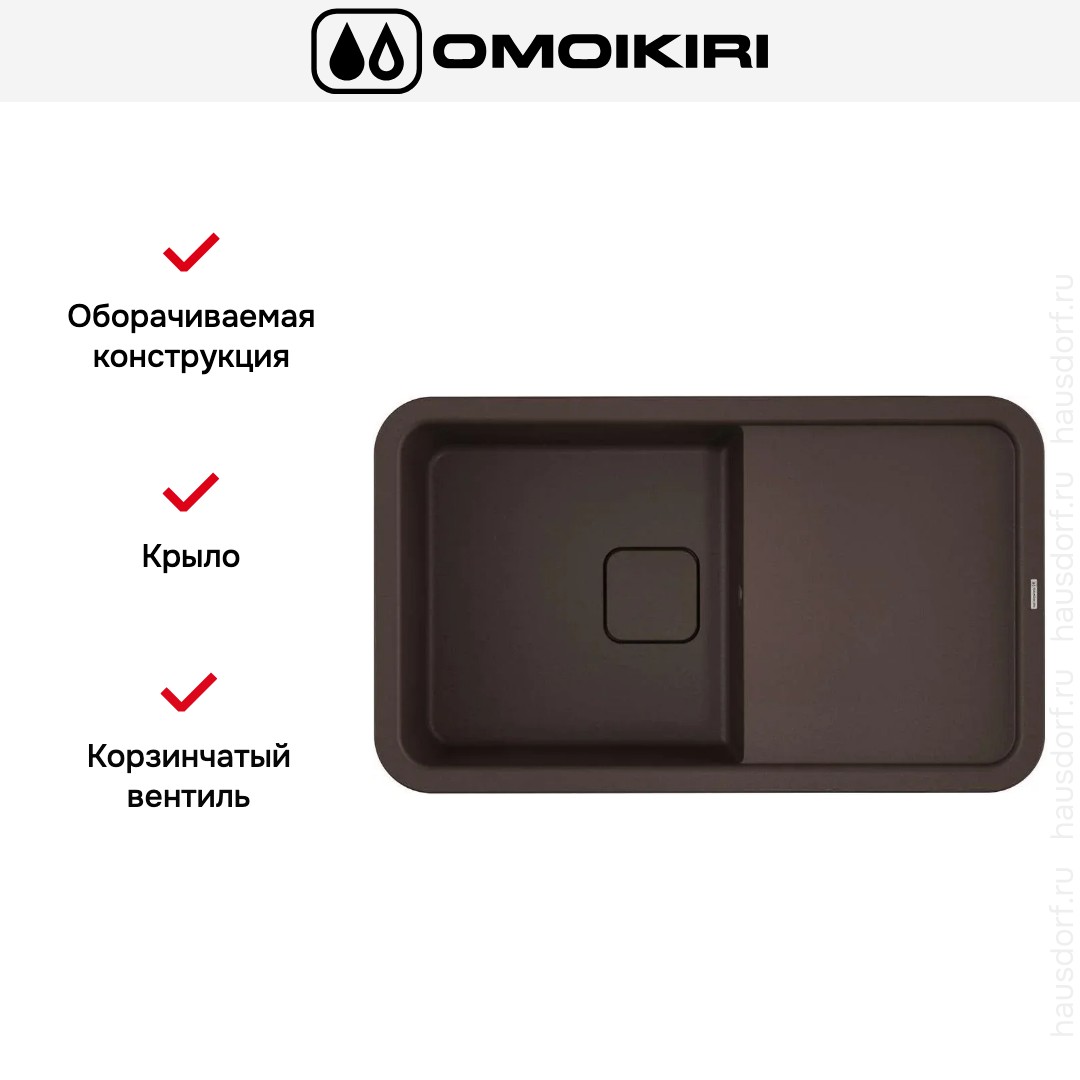 Обратите внимание на дизайнерские отличия мойки Омойкири, которые помогут в создании идеальной кухни в вашем доме. Она выполнена в цвете темный шоколад. Крыло, расположенное является дополнительным рабочим пространством, на котором можно сушить посуду, разделывать мясо и нарезать овощи.