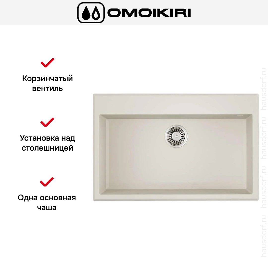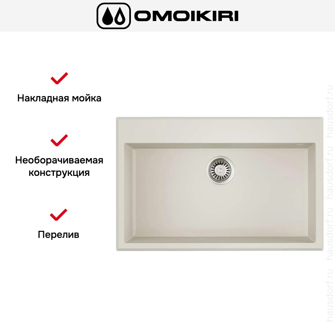 Накладная мойка Omoikiri — отличный выбор для тех, кто хочет создать гармоничное пространство с удобной сантехникой. простой в установке. Преимущество такой конструкции: легко подобрать практически к любой кухне и не придется демонтировать вместе с тумбой при ремонте или перестановке остальной мебели. Данная модель имеет стандартную форму, поэтому подходит большинству пользователей. Устанавливается над столешницей: это самый простой способ монтажа, зачастую с ним можно справиться даже без специалистов, главное — правильно рассчитать размеры ниши.