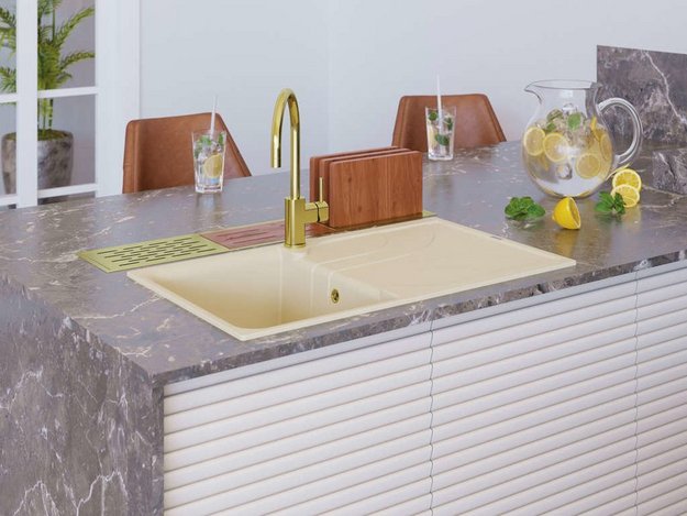 Обратите внимание на дизайнерские отличия мойки Омойкири, которые помогут в создании идеальной кухни в вашем доме. Она выполнена в цвете бежевый. Крыло, расположенное является дополнительным рабочим пространством, на котором можно сушить посуду, разделывать мясо и нарезать овощи.