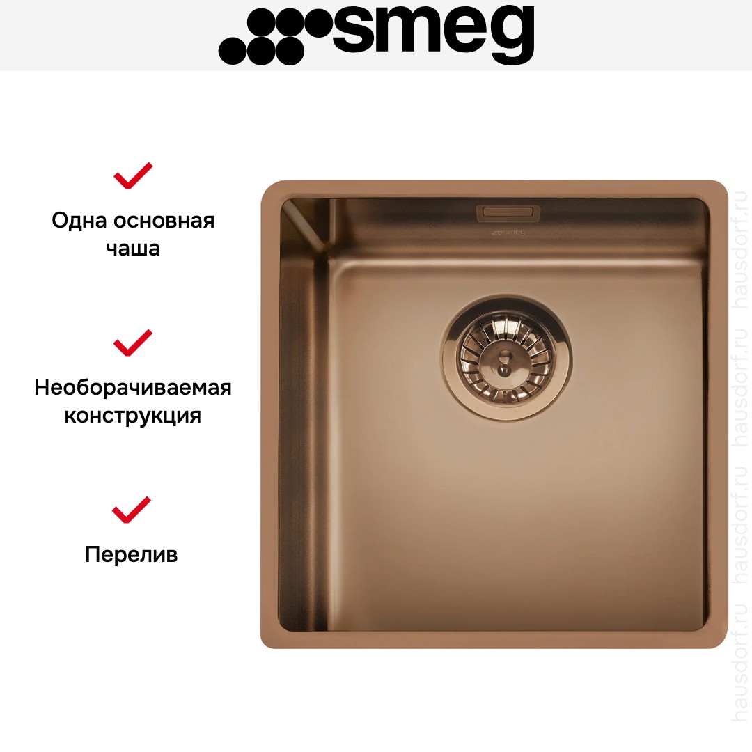 Мойка Smeg VSTR40CUX — изысканная врезная модель квадратной формы, сочетающая в себе функциональность, компактность и выразительный дизайн. Её габариты — 44×44 см — обеспечивают сбалансированное внутреннее пространство, в котором глубина чаши равна ширине, что создаёт оптимальные условия для выполнения повседневных задач: от мытья посуды до подготовки ингредиентов. Такая геометрия эффективно снижает разбрызгивание воды и придаёт изделию визуальную гармонию.
