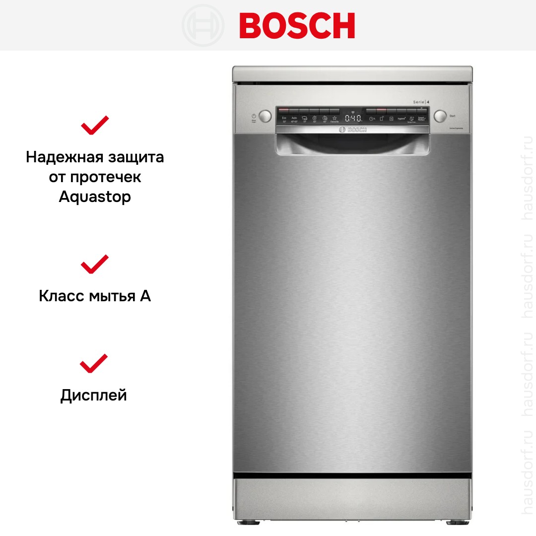 Отдельностоящая модель Бош отлично впишется в кухонный интерьер, главное — правильно выбрать место, чтобы подвести коммуникации. Имеет уменьшенную ширину — благодаря этому поместится даже на очень маленькой кухне. В камеру можно загрузить ограниченное число комплектов: 10 шт. Комплектом считается набор посуды на одного человека, который нужен для полноценного приема пищи: глубокая и плоская тарелки, тарелка для салата, блюдце под чашку, сама чашка, ложка и вилка.