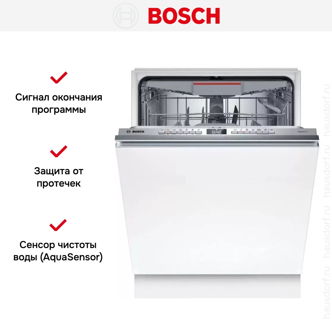 Встраиваемая модель Бош отлично впишется в любой интерьер, главное — правильно выбрать место, чтобы подвести коммуникации. Устанавливается в нишу целиком, полностью закрывается декоративной панелью. Обратите внимание: в комплекте не идет фасад, его необходимо установить самостоятельно. Имеет стандартные размеры, поэтому может не поместиться на очень маленькой кухне. В камеру можно загрузить ограниченное число комплектов: 14 шт. Комплектом считается набор посуды на одного человека, который нужен для полноценного приема пищи: глубокая и плоская тарелки, тарелка для салата, блюдце под чашку, сама чашка, ложка и вилка.