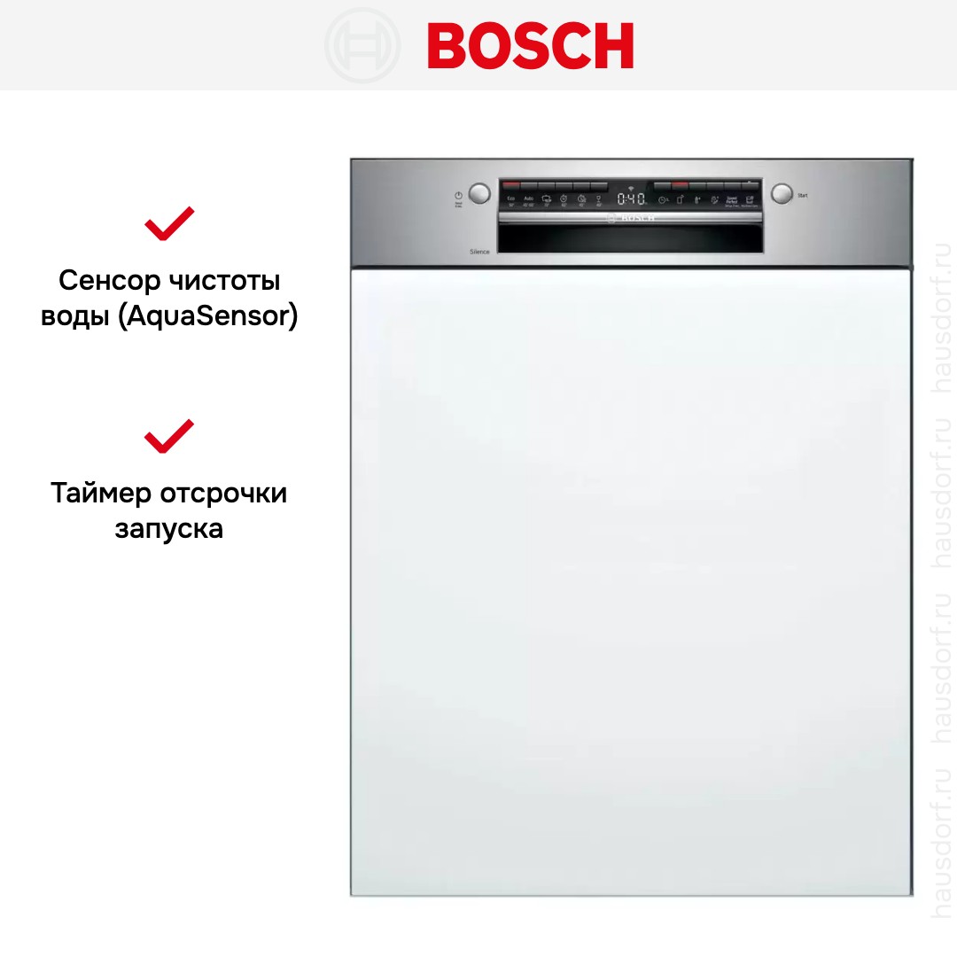 Встраиваемая модель Бош отлично впишется в любой интерьер, главное — правильно выбрать место, чтобы подвести коммуникации. Обратите внимание: в комплекте не идет фасад, его необходимо установить самостоятельно. Устанавливается в нишу неполностью, остается открытой панель управления. Имеет стандартные размеры, поэтому может не поместиться на очень маленькой кухне. В камеру можно загрузить ограниченное число комплектов: 13 шт. Комплектом считается набор посуды на одного человека, который нужен для полноценного приема пищи: глубокая и плоская тарелки, тарелка для салата, блюдце под чашку, сама чашка, ложка и вилка.