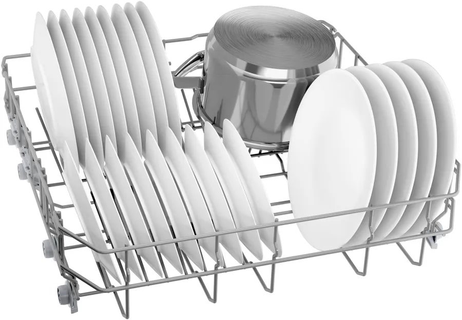 Встраиваемая модель Бош отлично впишется в любой интерьер, главное — правильно выбрать место, чтобы подвести коммуникации. Устанавливается в нишу целиком, полностью закрывается декоративной панелью. Обратите внимание: в комплекте не идет фасад, его необходимо установить самостоятельно. Имеет стандартные размеры, поэтому может не поместиться на очень маленькой кухне. В камеру можно загрузить ограниченное число комплектов: 14 шт. Комплектом считается набор посуды на одного человека, который нужен для полноценного приема пищи: глубокая и плоская тарелки, тарелка для салата, блюдце под чашку, сама чашка, ложка и вилка.