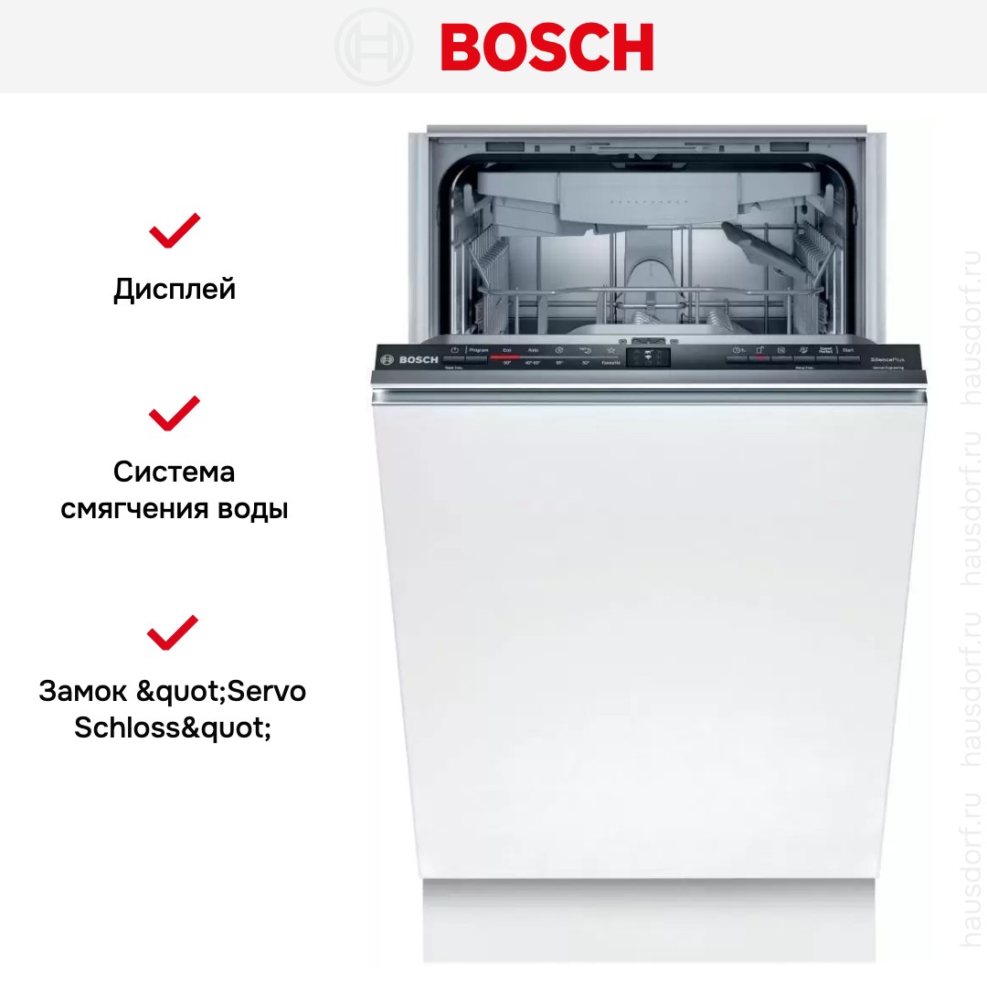 Встраиваемая модель Бош отлично впишется в любой интерьер, главное — правильно выбрать место, чтобы подвести коммуникации. Устанавливается в нишу целиком, полностью закрывается декоративной панелью. Обратите внимание: в комплекте не идет фасад, его необходимо установить самостоятельно. Имеет уменьшенную ширину — благодаря этому поместится даже на очень маленькой кухне. В камеру можно загрузить ограниченное число комплектов: 10 шт. Комплектом считается набор посуды на одного человека, который нужен для полноценного приема пищи: глубокая и плоская тарелки, тарелка для салата, блюдце под чашку, сама чашка, ложка и вилка.