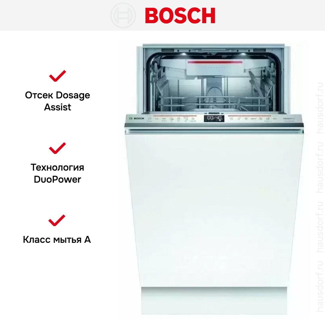 Встраиваемая модель Бош отлично впишется в любой интерьер, главное — правильно выбрать место, чтобы подвести коммуникации. Устанавливается в нишу целиком, полностью закрывается декоративной панелью. Обратите внимание: в комплекте не идет фасад, его необходимо установить самостоятельно. Имеет уменьшенную ширину — благодаря этому поместится даже на очень маленькой кухне. В камеру можно загрузить ограниченное число комплектов: 10 шт. Комплектом считается набор посуды на одного человека, который нужен для полноценного приема пищи: глубокая и плоская тарелки, тарелка для салата, блюдце под чашку, сама чашка, ложка и вилка.