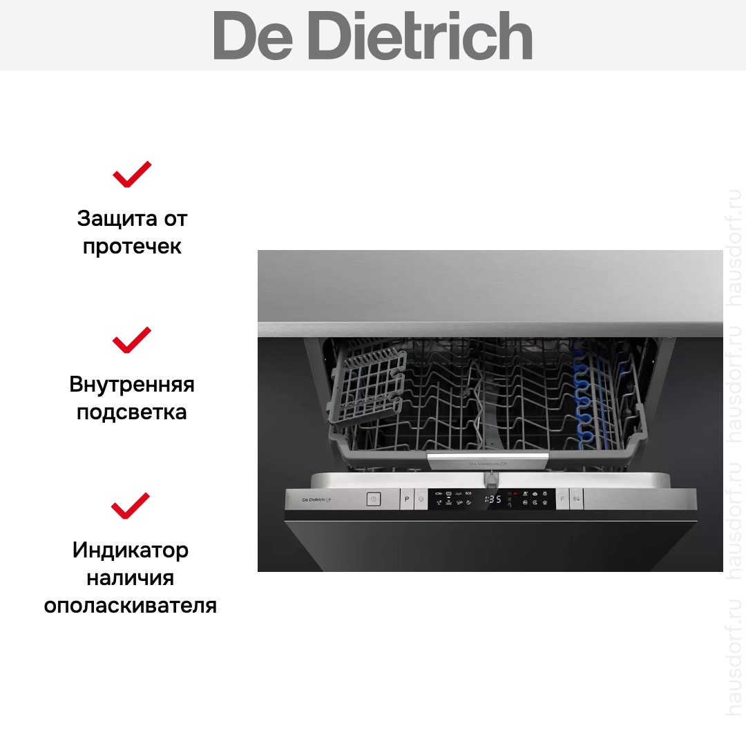 Встраиваемая модель Де Дитрих отлично впишется в любой интерьер, главное — правильно выбрать место, чтобы подвести коммуникации. Устанавливается в нишу целиком, полностью закрывается декоративной панелью. Обратите внимание: в комплекте не идет фасад, его необходимо установить самостоятельно. Имеет стандартные размеры, поэтому может не поместиться на очень маленькой кухне. В камеру можно загрузить ограниченное число комплектов: 14 шт. Комплектом считается набор посуды на одного человека, который нужен для полноценного приема пищи: глубокая и плоская тарелки, тарелка для салата, блюдце под чашку, сама чашка, ложка и вилка.