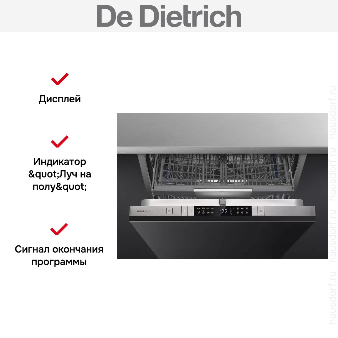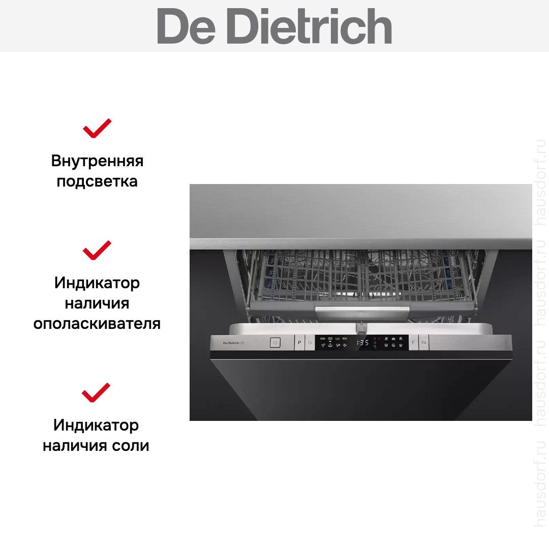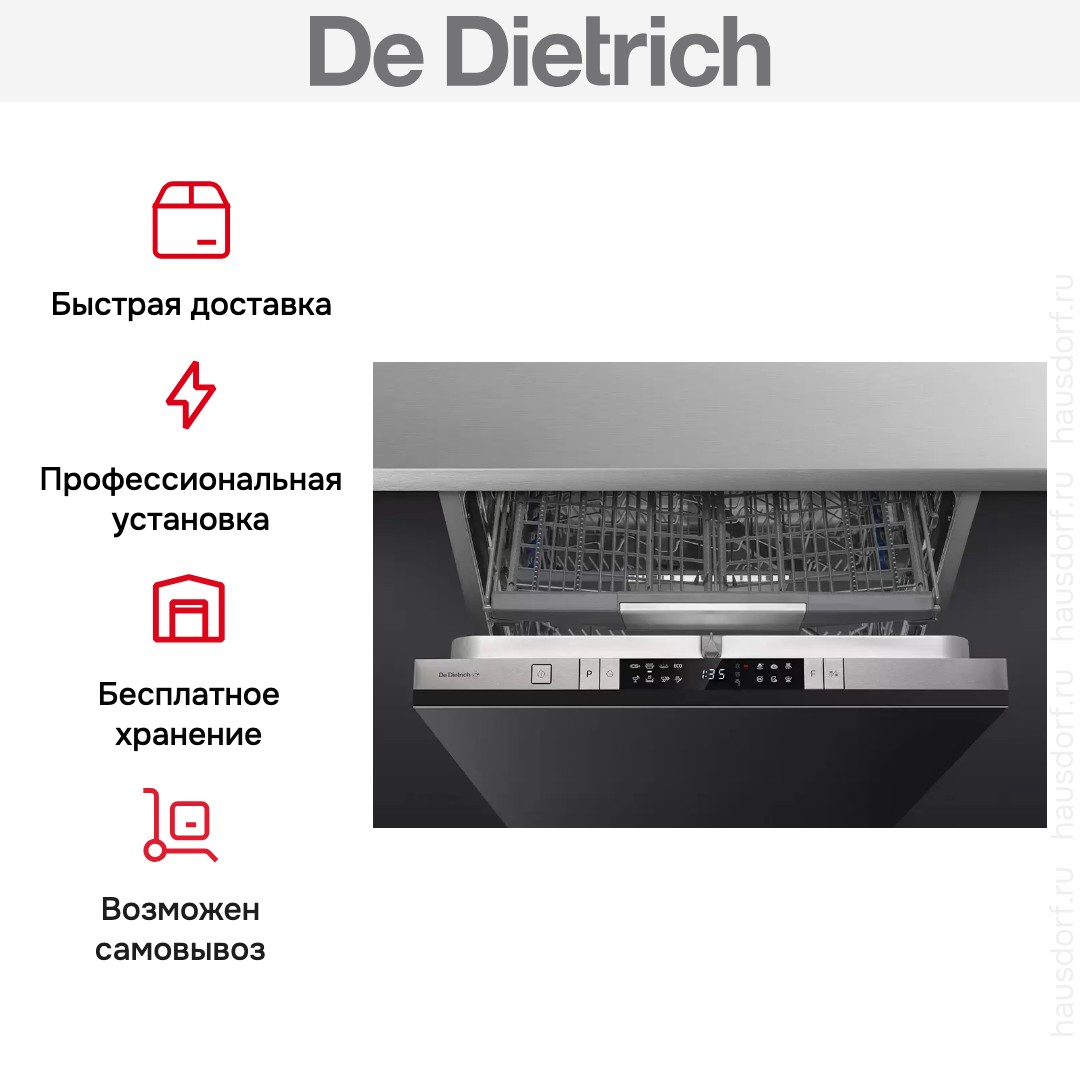 Встраиваемая модель Де Дитрих отлично впишется в любой интерьер, главное — правильно выбрать место, чтобы подвести коммуникации. Устанавливается в нишу целиком, полностью закрывается декоративной панелью. Обратите внимание: в комплекте не идет фасад, его необходимо установить самостоятельно. Имеет стандартные размеры, поэтому может не поместиться на очень маленькой кухне. В камеру можно загрузить ограниченное число комплектов: 15 шт. Комплектом считается набор посуды на одного человека, который нужен для полноценного приема пищи: глубокая и плоская тарелки, тарелка для салата, блюдце под чашку, сама чашка, ложка и вилка.