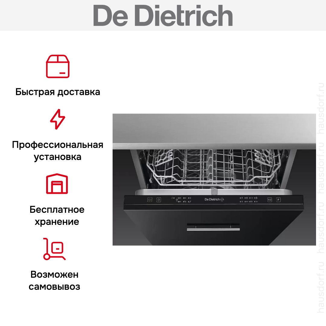 Встраиваемая модель Де Дитрих отлично впишется в любой интерьер, главное — правильно выбрать место, чтобы подвести коммуникации. Устанавливается в нишу целиком, полностью закрывается декоративной панелью. Обратите внимание: в комплекте не идет фасад, его необходимо установить самостоятельно. Имеет стандартные размеры, поэтому может не поместиться на очень маленькой кухне. В камеру можно загрузить ограниченное число комплектов: 13 шт. Комплектом считается набор посуды на одного человека, который нужен для полноценного приема пищи: глубокая и плоская тарелки, тарелка для салата, блюдце под чашку, сама чашка, ложка и вилка.