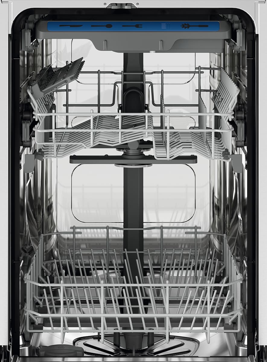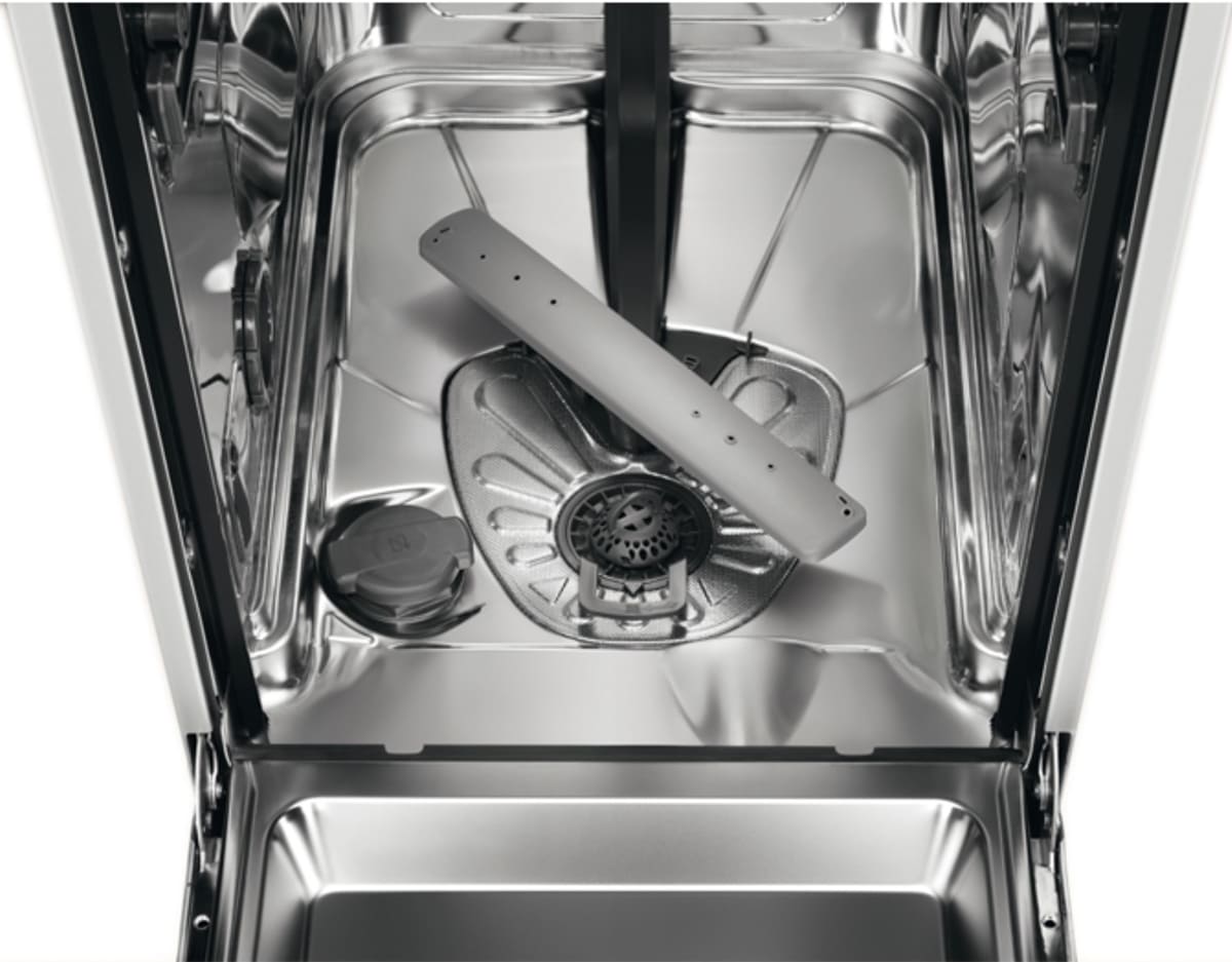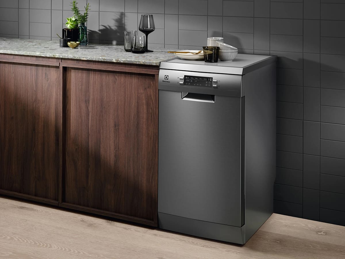 Отдельностоящая модель Электролюкс отлично впишется в кухонный интерьер, главное — правильно выбрать место, чтобы подвести коммуникации. Имеет уменьшенную ширину — благодаря этому поместится даже на очень маленькой кухне. В камеру можно загрузить ограниченное число комплектов: 10 шт. Комплектом считается набор посуды на одного человека, который нужен для полноценного приема пищи: глубокая и плоская тарелки, тарелка для салата, блюдце под чашку, сама чашка, ложка и вилка.