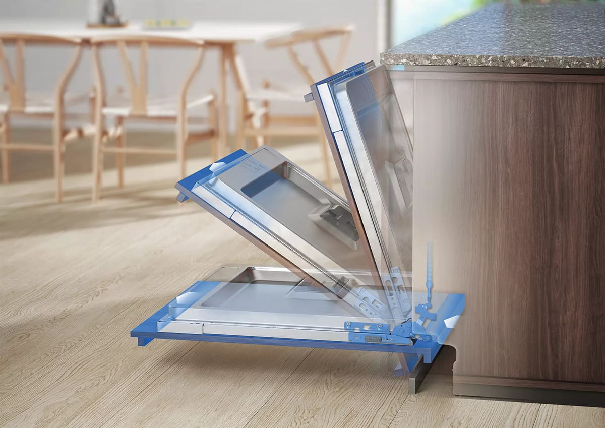 Встраиваемые устройства устанавливаются в тумбу или нишу мебельного гарнитура. В случае, если они полностью закрыты мебельным фасадом, машины считаются полностью встраиваемыми. Такое размещение позволяет сохранить единый стиль интерьера. Панель управления их также скрыта — чтобы начать работу и задать программу, дверцу придется открыть.