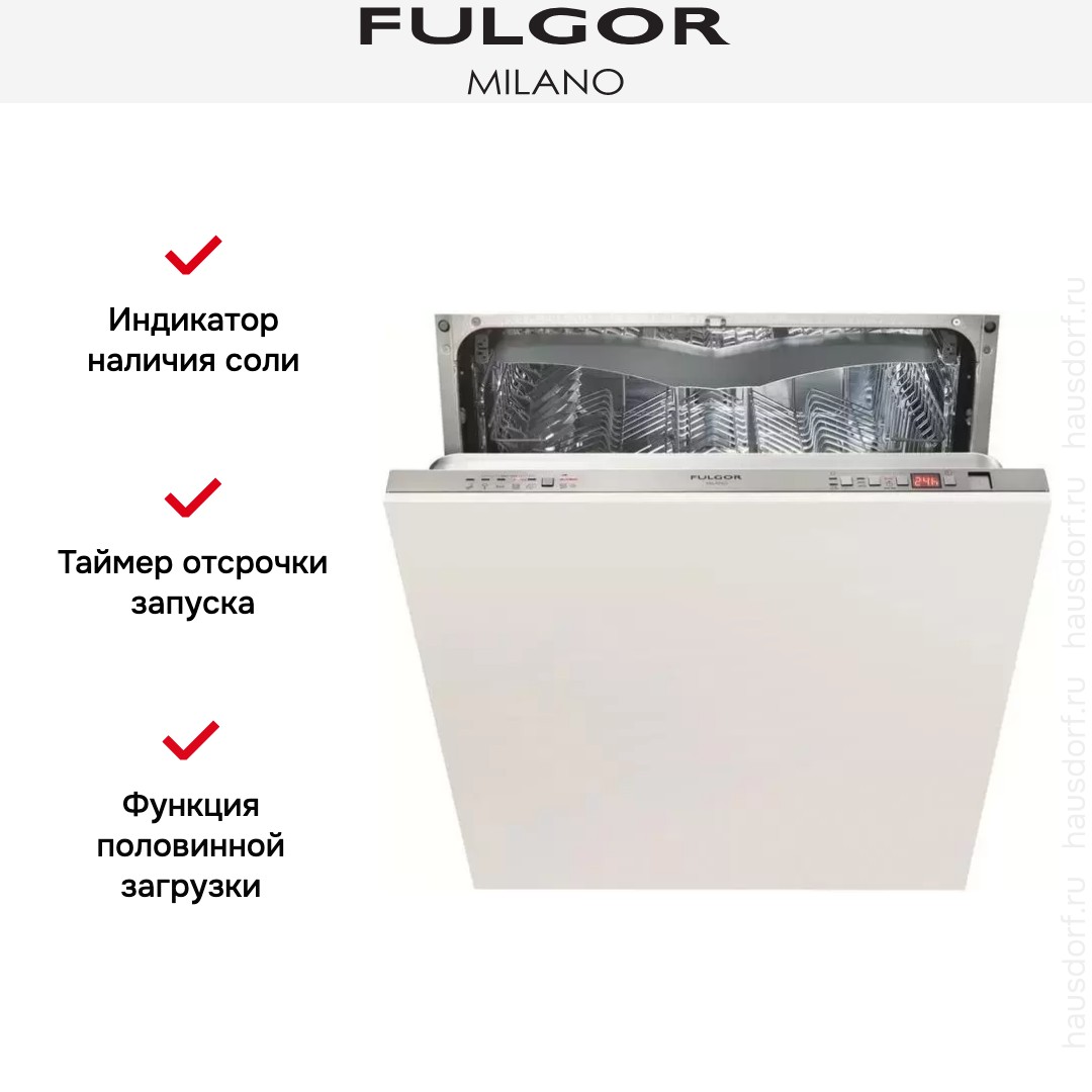 Встраиваемая модель Фулгор Милано отлично впишется в любой интерьер, главное — правильно выбрать место, чтобы подвести коммуникации. Устанавливается в нишу целиком, полностью закрывается декоративной панелью. Обратите внимание: в комплекте не идет фасад, его необходимо установить самостоятельно. Имеет стандартные размеры, поэтому может не поместиться на очень маленькой кухне. В камеру можно загрузить ограниченное число комплектов: 13 шт. Комплектом считается набор посуды на одного человека, который нужен для полноценного приема пищи: глубокая и плоская тарелки, тарелка для салата, блюдце под чашку, сама чашка, ложка и вилка.